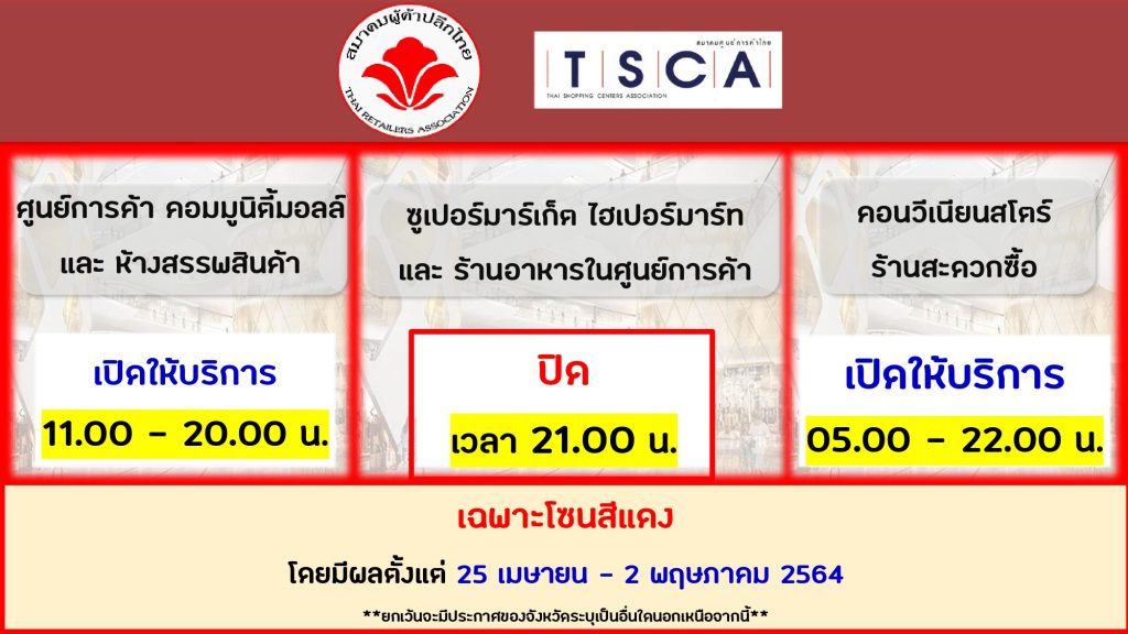นายญนน์ โภคทรัพย์ ประธานสมาคมผู้ค้าปลีกไทย แจ้งว่า สมาคมผู้ค้าปลีกไทย และสมาคมศูนย์การค้าไทย ตระหนักถึงความจำเป็นที่ต้องยกระดับมาตรการการเฝ้าระวังการระบาดของโควิดขึ้นอีกระดับหนึ่ง โดยสมาชิกสมาคมทั้งสองแห่งและภาคีเครือข่ายทั่วประเทศ จะเพิ่มมาตรการเข้มข้นในการคัดกรองผู้บริโภคเข้าศูนย์การค้าและห้างสรรพสินค้า ในระดับสูงสุด โดยประกาศเลื่อนการเปิด-ปิดศูนย์การค้าและห้างสรรพสินค้าทั่วประเทศ เป็นเวลา 11.00- 20.00 น. ยกเว้น ซูเปอร์มาร์เก็ต ไฮเปอร์มาร์ท และร้านอาหารที่ตั้งในศูนย์การค้าจะยังคงให้บริการถึง 21.00 น. ส่วนร้านค้าสะดวกซื้อจะให้บริการตามเวลา 05.00 – 22.00 น. ทั้งนี้มีผลครอบคลุมเฉพาะพื้นที่สีแดง 18 จังหวัดเท่านั้น ตั้งแต่วันอาทิตย์ที่ 25 เมษายน จนถึง วันอาทิตย์ที่ 2 พฤษภาคม 2564 (ยกเว้นจะมีประกาศของจังหวัด ระบุอื่นใดนอกเหนือจากนี้)