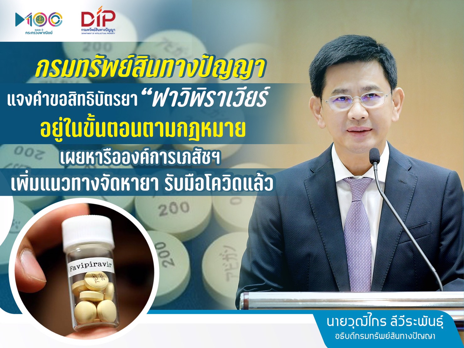นายวุฒิไกร ลีวีระพันธุ์ อธิบดีกรมทรัพย์สินทางปัญญา เปิดเผยถึงกรณีที่ภาคประชาสังคมสอบถามความคืบหน้าการพิจารณาคำขอรับสิทธิบัตรยาฟาวิพิราเวียร์ (Favipiravir) ซึ่งเป็นยาสำคัญที่ใช้ในการรักษาโรคโควิด-19 ว่า “สิทธิบัตรที่เกี่ยวข้องกับยาฟาวิพิราเวียร์หลักๆ แล้ว มีอยู่ 2 ฉบับ ฉบับแรก เกี่ยวกับโครงสร้างสารออกฤทธิ์หลักของยาฟาวิพิราเวียร์ ซึ่งไม่เคยยื่นขอรับสิทธิบัตรในประเทศไทย ปัจจุบันหมดอายุความคุ้มครองในทุกประเทศทั่วโลกแล้ว ตั้งแต่เดือนสิงหาคม 2562 ดังนั้น ผู้ผลิตยาจึงสามารถนำสูตรโครงสร้างของสารออกฤทธิ์หลักนี้ไปพัฒนาเป็นสูตรยาเพื่อใช้ประโยชน์ทางการแพทย์ได้ทันที