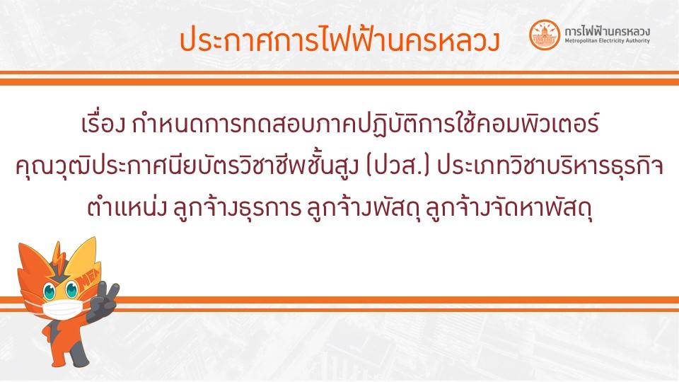 ประกาศการไฟฟ้านครหลวง เรื่อง กำหนดการทดสอบภาคปฏิบัติการใช้คอมพิวเตอร์ ตำแหน่งลูกจ้างธุรการ ลูกจ้างพัสดุ และลูกจ้างจัดหาพัสดุ