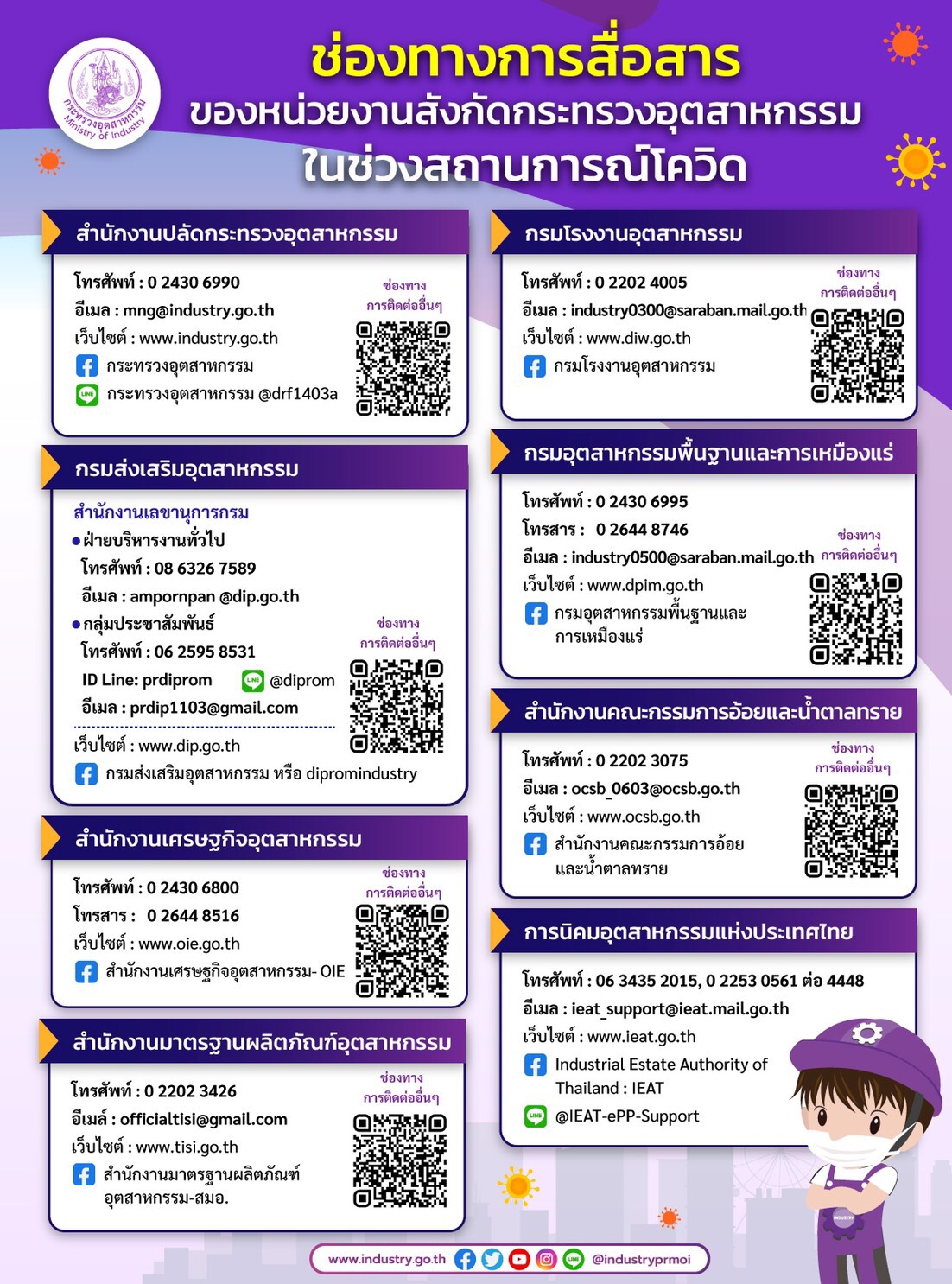 -สำนักงานปลัดกระทรวงอุตสาหกรรม โทรศัพท์ : 0 2430 6990 อีเมล์ : mng@industry.go.th เว็บไซต์ : www.industry.go.th Facebook Fan Page : กระทรวงอุตสาหกรรม Line : กระทรวงอุตสาหกรรม @drf1403a