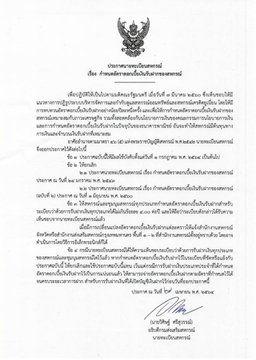 ทั้งนี้อาศัยอาศัยอำนาจตามมาตรา 46 (5) แห่งพระราชบัญญัติสหกรณ์ พ.ศ. 2542 นายทะเบียนสหกรณ์จึงออกประกาศไว้ดังต่อไปนี้ในคำสั่งดังกล่าวกำหนดให้สหกรณ์และชุมนุมสหกรณ์ทุกประเภทกำหนดอัตราดอกเบี้ยเงินรับฝากสำหรับการรับฝากเงินทุกประเภทได้ไม่เกินร้อยละ 4.00 ต่อปี โดยให้มีผลใช้บังคับตั้งแต่วันที่ 1 กรกฎาคม พ.ศ. 2564 เป็นต้นไป รวมทั้งให้ยกเลิกประกาศนายทะเบียนสหกรณ์เดิมซึ่งแยกเป็น 2 ฉบับคือฉบับประกาศ ณ วันที่ 24 มกราคม พ.ศ. 2543 ซึ่งกำหนดอัตราดอกเบี้ยของสหกรณ์ในการรับฝากเงินได้ไม่เกินร้อยละ 7 ต่อปีและฉบับที่ 2 ประกาศ ณ วันที่ 1 มิถุนายน พ.ศ. 2560 ซึ่งกำหนดอัตราดอกเบี้ยเงินรับฝากของสหกรณ์ออมทรัพย์และเครดิตยูเนี่ยนได้ไม่เกินร้อยละ 4.5 ต่อปี