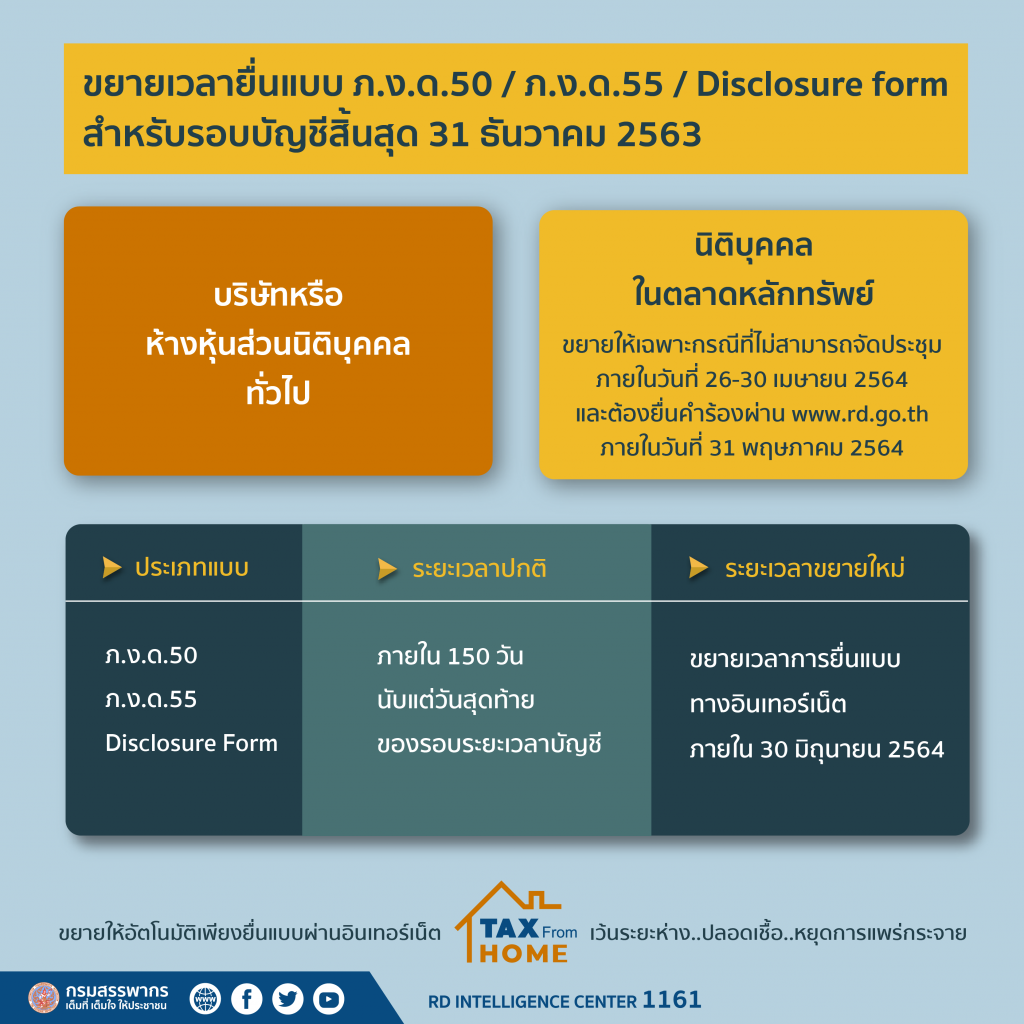 1.2 ขยายกำหนดเวลายื่นแบบรายงานประจำปี สำหรับบริษัทหรือห้างหุ้นส่วนนิติบุคคลที่มีความสัมพันธ์กันตามมาตรา 71 ทวิ แห่งประมวลรัษฎากร (Disclosure Form) ของรอบระยะเวลาบัญชีปี 2563 ที่ต้องดำเนินการผ่านอินเทอร์เน็ตภายในเดือนพฤษภาคม 2564 ถึงเดือนมิถุนายน 2564 ออกไปเป็นภายในวันที่ 30 มิถุนายน 2564 โดยต้องยื่นแบบรายงานประจำปีผ่านอินเทอร์เน็ตเท่านั้น - กรณีบริษัทที่จดทะเบียนในตลาดหลักทรัพย์แห่งประเทศไทย