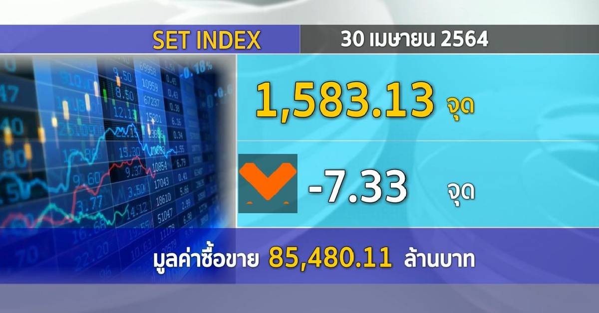 กทม. 30 เม.ย.-ตลาดหลักทรัพย์ปิดวันนี้ที่ระดับ 1,583.13 จุด ลดลง 7.33 จุด (-0.46%) มูลค่าการซื้อขาย 85,480.11 ล้านบาท ตลาดหุ้นไทยปิดทำการ 4 วันติดต่อกัน ทำให้เกิดแรงขายทำกำไรเพื่อลดความเสี่ยง เนื่องจากยังไม่รู้ว่าสถานการณ์โควิด-19