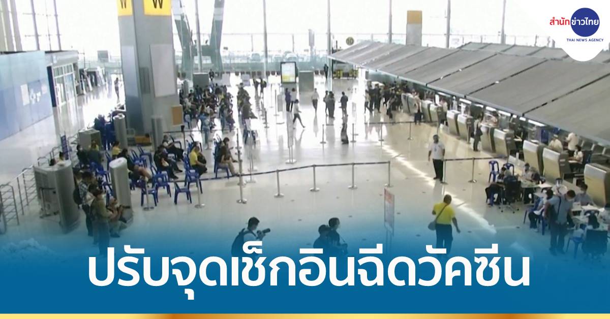 ภายในอาคารผู้โดยสารขาออกของสนามบินสุวรรณภูมิ บริเวณประตู 9และ 10 ที่เคยเป็นส่วนรองรับผู้โดยสารขาออกในการเช็กอินกับสายการบินต่างๆ ได้ถูกปรับเป็นพื้นที่ฉีดวัคซีนให้กับบุคลากรด้านหน้าที่เกี่ยวข้องกับการพบปะผู้โดยสาร ทั้งพนักงานสายการบิน เจ้าหน้าที่การท่าฯ เจ้าหน้าที่ตรวจคนเข้าเมือง ศุลกากร คาร์โก้ แม่บ้านทำความสะอาด โดยมีผู้รับการฉีดวัคซีนซิโนแวคเข็ม 2 แล้ว จำนวน 3,400 คน จากจำนวนเป้าหมายทั้งหมด 30,000 คน