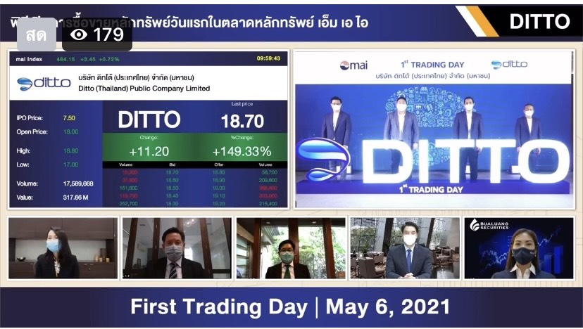 กรุงเทพฯ 6 พ.ค. – หุ้น DITTO เปิดเทรดวันแรกที่ 18 บาท เพิ่มขึ้น 10.50 บาท (+140%) จากราคาขาย IPO ที่ 7.50 บาท/หุ้น