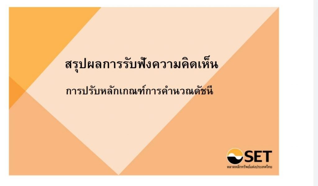 ตลาดหลักทรัพย์แห่งประเทศไทย (ตลท.) แจ้งว่า ได้พิจารณาชะลอการปรับการคำนวณดัชนีของตลาดหลักทรัพย์ฯ ออกไปก่อน เพื่อไม่ให้ส่งผลกระทบต่อการดำเนินการของผู้เกี่ยวข้อง เนื่องจากผู้ให้ความเห็นส่วนมากไม่เห็นด้วยกับการปรับหลักเกณฑ์ดังกล่าว