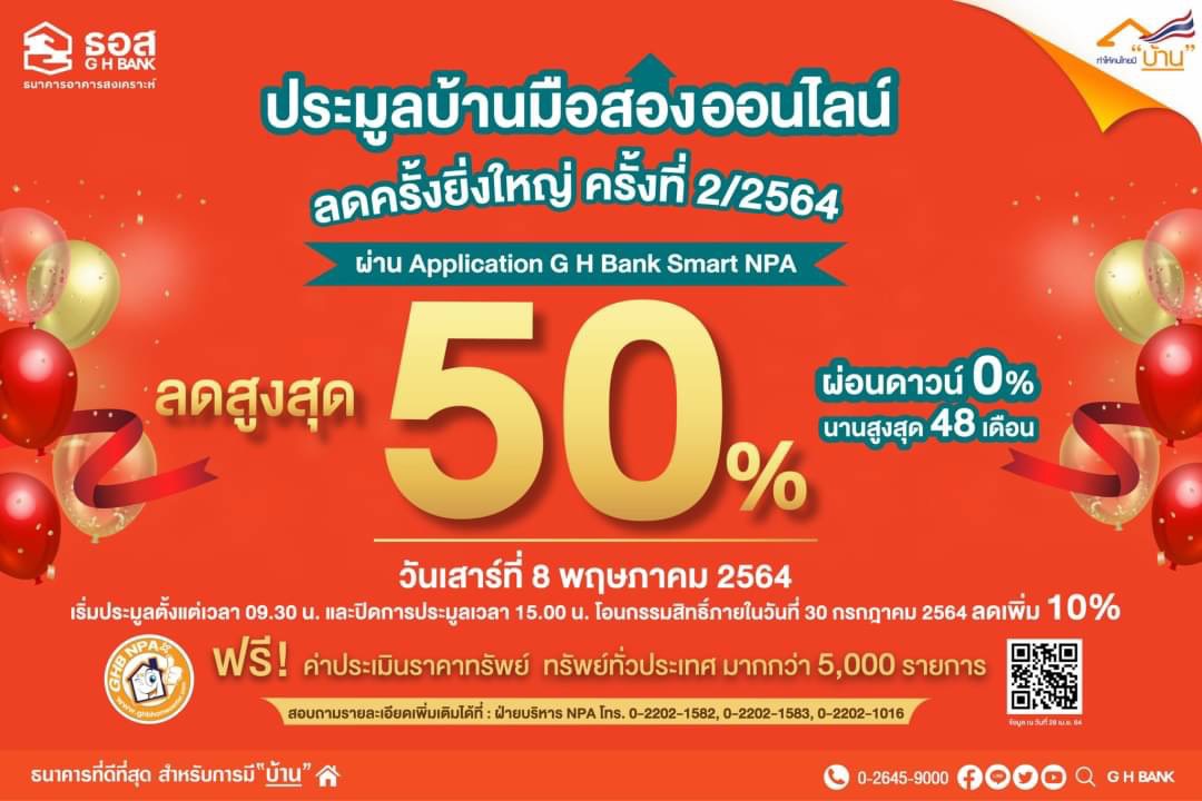 นายฉัตรชัย ศิริไล กรรมการผู้จัดการ ธนาคารอาคารสงเคราะห์ (ธอส.) เปิดเผยว่า ธอส. จัดงาน “ประมูลบ้านมือสองออนไลน์ ลดครั้งยิ่งใหญ่ ครั้งที่ 2/2564” ในวันเสาร์ที่ 8 พฤษภาคม 2564 ผ่าน Application : G H Bank Smart NPA นำทรัพย์ทั่วประเทศออกประมูลมากกว่า 5,000 รายการ ทั้งบ้านเดี่ยว บ้านแฝด ทาวน์เฮาส์ ห้องชุด แฟลต อาคารพาณิชย์ และที่ดินเปล่า ราคาเริ่มต้นลดสูงสุดถึง 50% จากราคาปกติ ราคาเริ่มต้นต่ำสุดเพียง 45,000 บาทเท่านั้น พิเศษ!! ผู้ชนะประมูลทรัพย์มีสิทธิ์เลือกใช้มาตรการผ่อนดาวน์ดอกเบี้ย 0% นานสูงสุด 48 เดือน (จากปกติ 24 เดือน) หรือเลือกเทดาวน์แล้วยื่นกู้เลย รับสินเชื่อดอกเบี้ย 0% นานสูงสุด 48 เดือน และได้รับส่วนลดราคาเพิ่มให้อีก 10% จากราคาที่ประมูลซื้อได้ เพียงโอนกรรมสิทธิ์ภายใน 30 กรกฎาคม 2564