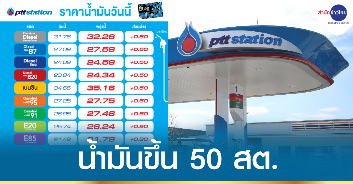 PTT Station ปรับขึ้นราคาขายปลีกน้ำมันทุกชนิด 50 สตางค์/ลิตร เว้น E85 ปรับขึ้น 30 สตางค์ /ลิตร มีผลพรุ่งนี้ (7 พ.ค.64) เวลา 05.00 น. เป็นต้นไป โดยราคาขายปลีกจะเป็นดังนี้ ULG = 35.16, GSH95 = 27.75, E20 = 26.24, GSH91 = 27.48, E85 = 21.79, HSD-B7= 27.59, HSD-B10 = 24.59, HSD-B20 = 24.34, ดีเซลพรีเมียม B7 = 32.26 บาท/ลิตร โดยราคาขายปลีกข้างต้นยังไม่รวมภาษีบำรุงกรุงเทพมหานคร. – สำนักข่าวไทย