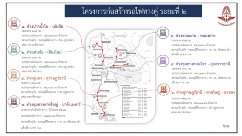 รวมทั้งการพิจารณาจุดตัดทางรถไฟกับทางหลวง ยังไม่มีรูปแบบมาตรฐานที่ชัดเจนว่าจะเป็นลักษณะของสะพานทางหลวงข้ามทางรถไฟ หรือสะพานรถไฟข้ามทางหลวง ดังนั้น ให้การรถไฟแห่งประเทศไทย ประสานงานกับกรมทางหลวงและกรมการขนส่งทางราง จัดทำตั้งแต่ขั้นตอนการออกแบบเพื่อกำหนดรูปแบบมาตรฐานร่วมกัน รวมทั้งประสานกับกรมการขนส่งทางบก เพื่อให้การเชื่อมต่อเส้นทางรถไฟกับสถานีขนส่งสินค้าที่เชียงของและนครพนม เป็นไปอย่างมีประสิทธิภาพ ,ประสานงานกับกรมการขนส่งทางบกและกรมการขนส่งทางราง เร่งรัดปรับแผนงานการก่อสร้างสถานีขนส่งสินค้าที่นาทา เพื่อให้ไทยได้ประโยชน์สูงสุดในการเชื่อมต่อ เส้นทางรถไฟจากจีน ลาว และไทย โดยในเบื้องต้นหากไม่สามารถพัฒนาเส้นทางรถไฟทางคู่ช่วงขอนแก่น – หนองคาย ได้ทัน อาจพิจารณาการพัฒนาในลักษณะ ทำเป็นเฟส โดยใช้การเชื่อมต่อทางถนนในระยะแรกก่อน