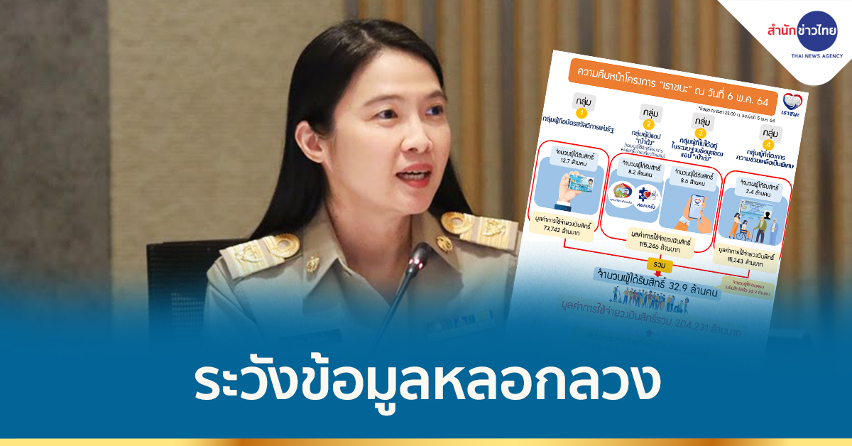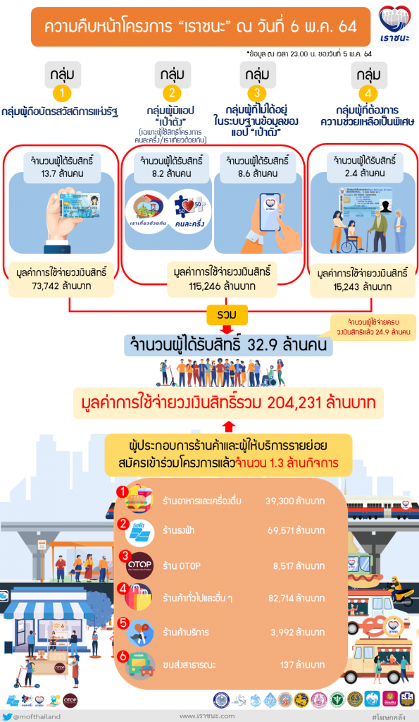 โฆษกกระทรวงการคลังได้แถลงเพิ่มเติมถึงความคืบหน้าของโครงการฯ ณ วันที่ 6 พฤษภาคม 2564 ดังนี้ 1) ประชาชนกลุ่มผู้ถือบัตรสวัสดิการแห่งรัฐ จำนวน 13.7 ล้านคน ได้มีการใช้จ่ายตั้งแต่วันที่ 5 กุมภาพันธ์ 2564 เป็นต้นมา จำนวน 73,742 ล้านบาท 2) ประชาชนกลุ่มที่อยู่ในระบบฐานข้อมูลของแอปพลิเคชัน “เป๋าตัง” ในโครงการเราเที่ยวด้วยกันและคนละครึ่ง และกลุ่มประชาชนทั่วไปที่ลงทะเบียนทางเว็บไซต์ www.เราชนะ.com ที่ผ่านการคัดกรองคุณสมบัติเบื้องต้นและยืนยันการใช้สิทธิ์ร่วมโครงการฯ แล้ว จำนวน 16.8 ล้านคน และมีการใช้จ่ายวงเงินสิทธิ์สะสมตั้งแต่วันที่ 18 กุมภาพันธ์ 2564 เป็นต้นมา จำนวน 115,246 ล้านบาท และ 3) ประชาชน กลุ่มผู้ที่ต้องการความช่วยเหลือเป็นพิเศษที่ผ่านการคัดกรองคุณสมบัติแล้ว จำนวน 2.4 ล้านคน มียอดใช้จ่ายวงเงินสิทธิ์สะสมตั้งแต่วันที่ 5 มีนาคม 2564 เป็นต้นมา จำนวน 15,243 ล้านบาท ทำให้มีผู้ได้รับสิทธิ์ในโครงการฯ แล้ว รวมทั้งสิ้นจำนวน 32.9 ล้านคน คิดเป็นมูลค่าการใช้จ่ายหมุนเวียนในระบบเศรษฐกิจไทยแล้วกว่า 204,231 ล้านบาท และมีผู้ได้รับสิทธิ์ในโครงการฯ ที่ใช้จ่ายจนครบวงเงินสิทธิ์แล้ว จำนวน 24.9 ล้านคน ซึ่งเป็นการใช้จ่ายผ่านผู้ประกอบการร้านธงฟ้าราคาประหยัดพัฒนาเศรษฐกิจท้องถิ่นที่มีแอปพลิเคชัน “ถุงเงิน” ร้านค้าคนละครึ่งที่ตกลงยินยอมเข้าร่วมโครงการฯ รวมถึงผู้ประกอบการร้านค้าและผู้ให้บริการที่ลงทะเบียนเข้าร่วมโครงการฯ จำนวนทั้งสิ้นมากกว่า 1.3 ล้านกิจการ.-สำนักข่าวไทย