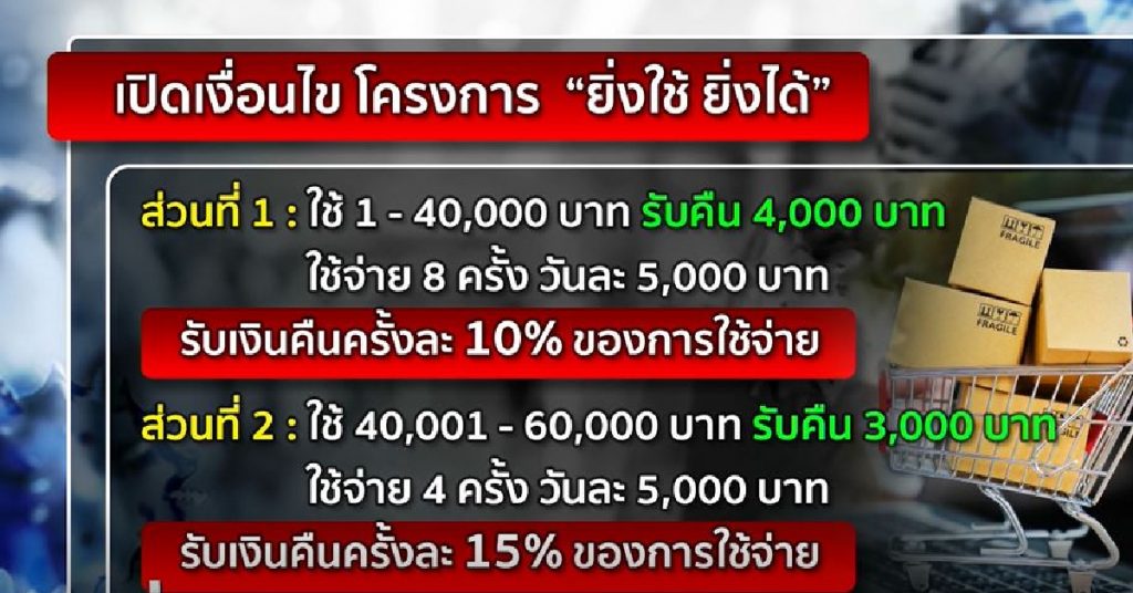 รายละเอียดของโครงการนี้ กระทรวงการคลังออกแบบโครงการเพื่อให้ผู้มีกำลังซื้อใช้จ่ายรวม 60,000 บาท แล้วจะได้รับเงินคืน 7,000 บาท แบ่งเป็น 2 ส่วน คือ 1.เงินส่วนแรก 40,000 บาท ใช้จ่ายได้ 8 ครั้ง ในวันละ 5,000 บาท ส่วนนี้จะได้รับเงินคืนครั้งละ 10% ของการใช้จ่าย สะสมรวมเป็น 4,000 บาท 2.อีก 20,000 บาทที่เหลือ จะใช้จ่ายได้ 4 ครั้ง ในวันละ 5,000 บาท โดยจะได้รับเงินคืนครั้งละ 15% สะสมรวมเป็น 3,000 บาท