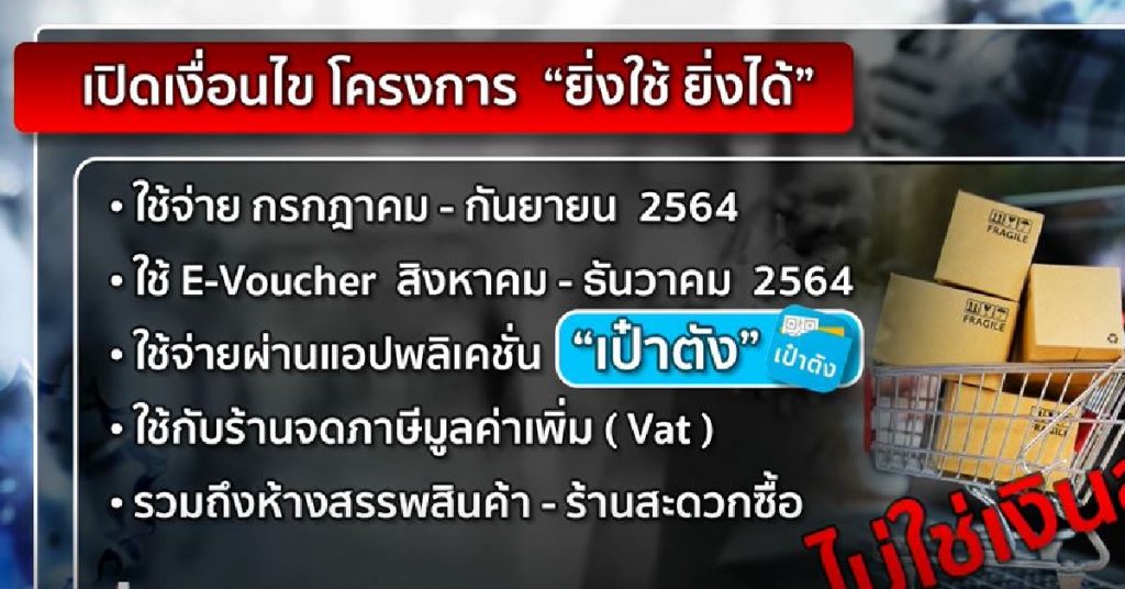 โดยการใช้จ่ายจะได้รับ E-Voucher ตั้งแต่เดือนกรกฎาคม-กันยายน 2564 และใช้จ่าย E-Voucher ได้ในเดือนสิงหาคม-ธันวาคม 2564 โดยประชาชนที่รับสิทธิจะต้องใช้จ่ายผ่านแอปพลิเคชันเป๋าตัง ด้วยการเติมเงินเข้าวอลเล็ต และใช้ร่วมกับร้านที่จดทะเบียนภาษีมูลค่าเพิ่ม หรือ Vat โดยร้านเหล่านี้รวมถึงในห้างสรรพสินค้า ร้านสะดวกซื้อ สามารถใช้ได้เช่นกัน ระบบจะคืนให้กับผู้ใช้สิทธิเป็น E-Voucher ไม่ใช่เงินสดแต่อย่างใด.-สำนักข่าวไทย