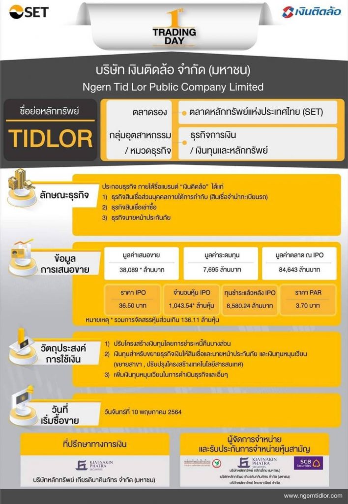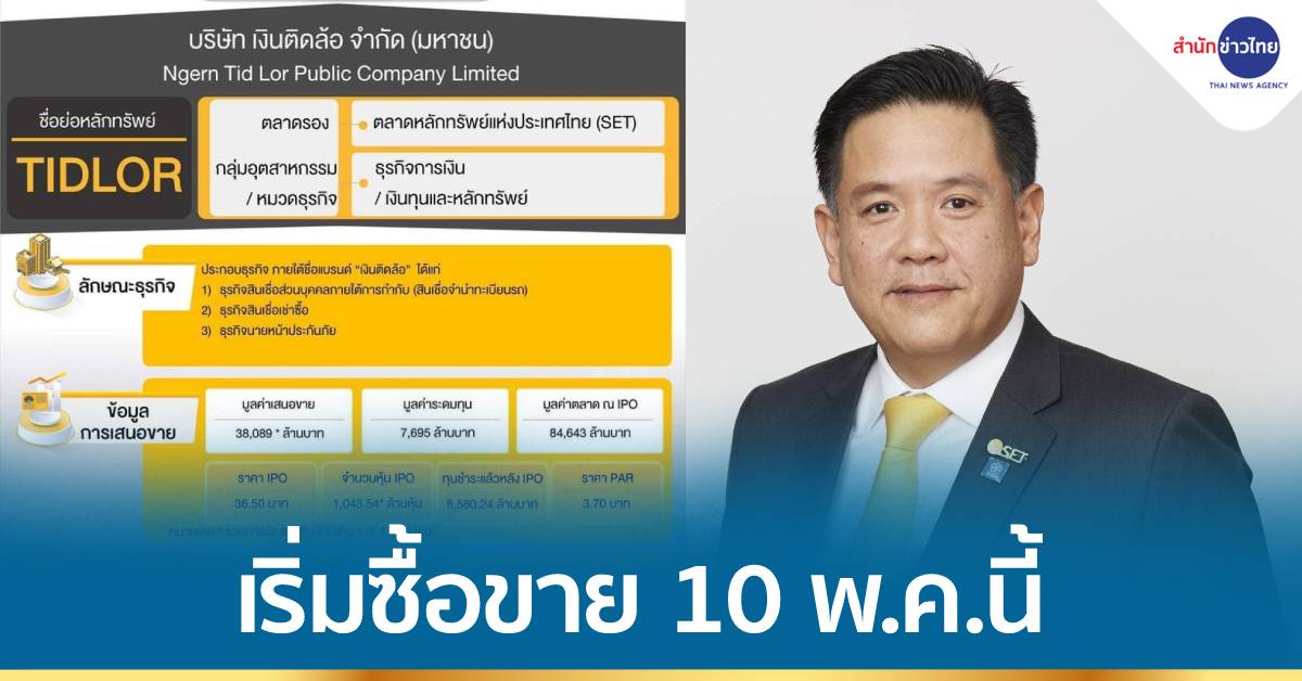 นายแมนพงศ์ เสนาณรงค์ รองผู้จัดการ หัวหน้าสายงานผู้ออกหลักทรัพย์ ตลาดหลักทรัพย์แห่งประเทศไทย เปิดเผยว่า ตลาดหลักทรัพย์ฯ ยินดีต้อนรับ บมจ. เงินติดล้อ เข้าจดทะเบียนและเริ่มซื้อขายในตลาดหลักทรัพย์ฯ ในกลุ่มอุตสาหกรรมธุรกิจการเงิน หมวดเงินทุนและหลักทรัพย์ โดยใช้ชื่อย่อในการซื้อขายหลักทรัพย์ว่า “TIDLOR” ในวันที่ 10 พฤษภาคม 2564