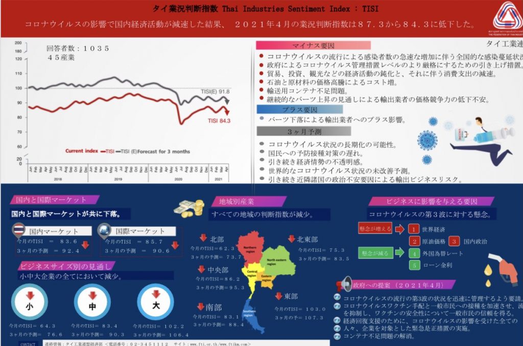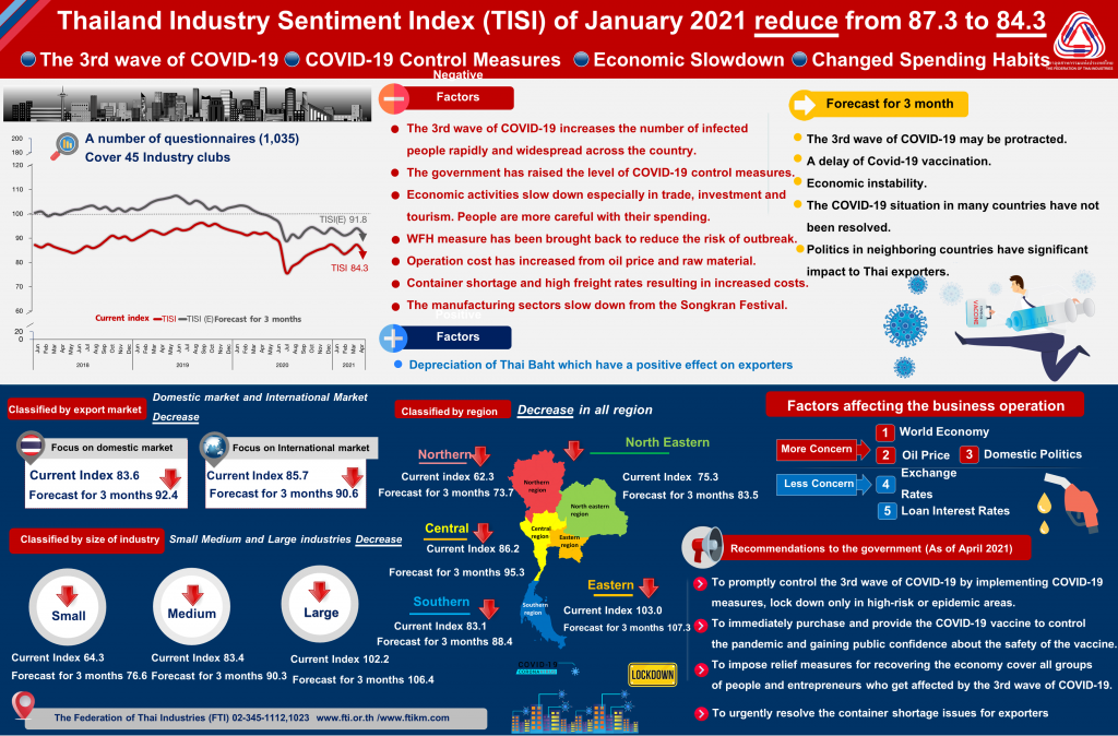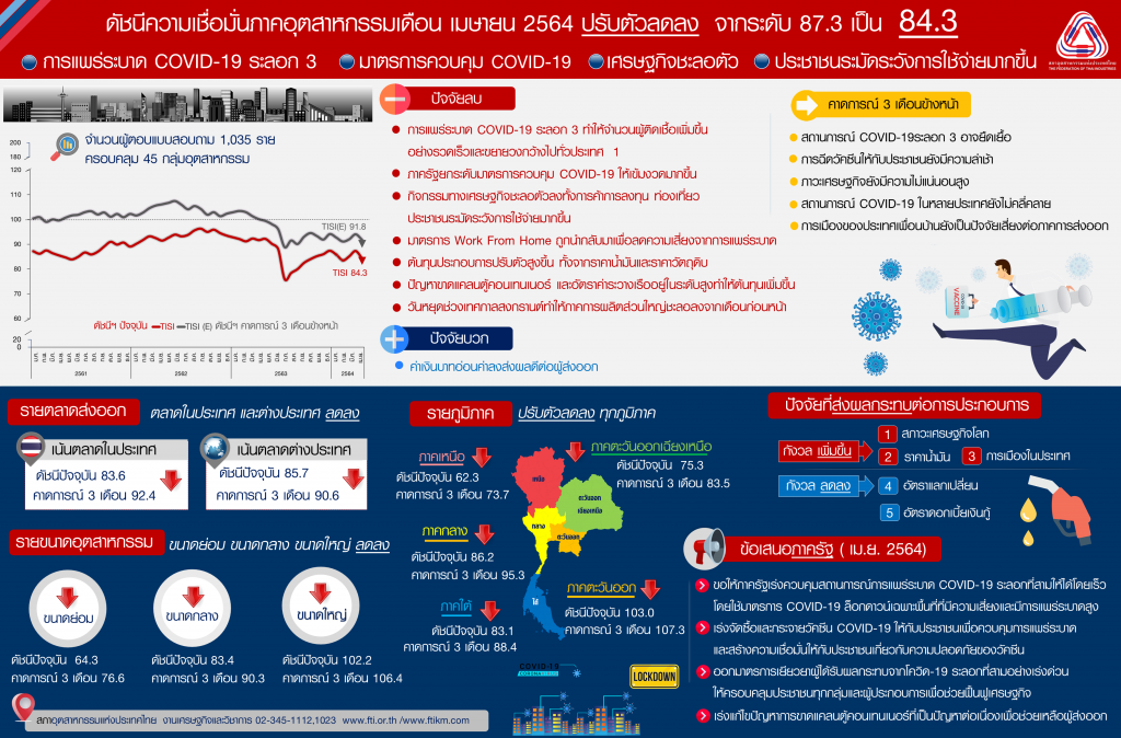 นายสุพันธุ์ มงคลสุธี ประธานสภาอุตสาหกรรมแห่งประเทศไทย (ส.อ.ท.) เปิดเผยผลการสำรวจดัชนีความเชื่อมั่นภาคอุตสาหกรรมในเดือนเมษายน 2564 อยู่ที่ระดับ 84.3 ปรับตัวลดลงจากระดับ 87.3 ในเดือนมีนาคม 2564 โดยค่าดัชนีฯ ปรับตัวลดลงต่ำสุดในรอบ 8 เดือน นับตั้งแต่เดือนกันยายน 2563 เนื่องจากผู้ประกอบการมีความกังวลต่อสถานการณ์การแพร่ระบาดของโควิด-19 ระลอกที่สาม ที่มีจำนวนผู้ติดเชื้อเพิ่มขึ้นอย่างรวดเร็วและขยายวงกว้างไปทั่วประเทศ ส่งผลให้ภาครัฐยกระดับมาตรการควบคุมโควิด-19 ให้เข้มงวดมากขึ้น แม้ว่าภาครัฐจะไม่ได้ประกาศมาตรการล็อกดาวน์หรือเคอร์ฟิวส์เหมือนกับการระบาดในระลอกแรก แต่วิกฤตโควิด-19 ระลอกที่สาม ได้ส่งผลกระทบต่อกิจกรรมทางเศรษฐกิจชะลอตัวลงทั้งการค้าการลงทุน การเดินทางท่องเที่ยว ประชาชนระมัดระวังการใช้จ่ายมากขึ้น ขณะที่มาตรการ Work From Home ถูกนำกลับมาใช้อีกครั้งเพื่อลดความเสี่ยงจากการแพร่ระบาดของโควิด-19 อย่างไรก็ตาม ในเดือนเมษายนยังมีวันทำงานน้อยเนื่องจากมีวันหยุดต่อเนื่องในช่วงเทศกาลสงกรานต์ทำให้ภาคการผลิตส่วนใหญ่ชะลอลงจากเดือนก่อนหน้า