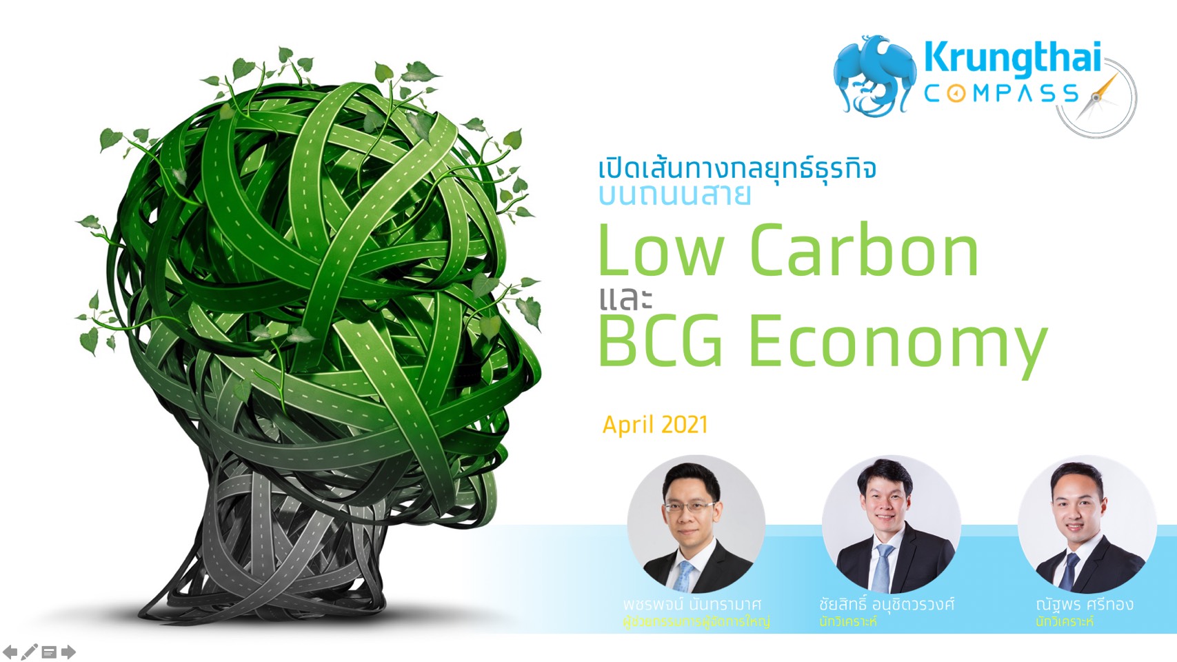 นายพชรพจน์ นันทรามาศ ผู้ช่วยกรรมการผู้จัดการใหญ่ ศูนย์วิจัย Krungthai COMPASS ธนาคารกรุงไทย ประเมินว่านอกจากการฟันฝ่าวิกฤตโควิด-19 ยังมีอีก 2 โจทย์ท้าทายสำหรับธุรกิจไทย นั่นคือ การสร้าง Growth engine ที่ตอบโจทย์ความยั่งยืน และการปรับตัวให้สอดรับกับบริบทใหม่ๆ ของโลก โดยเฉพาะการเคลื่อนสู่สังคมคาร์บอนต่ำ ตามเป้าหมายการพัฒนาที่ยั่งยืน (Sustainable Development Goal: SDG) และข้อตกลงปารีส (Paris Agreement) ขององค์การสหประชาชาติ ซึ่งจะมีนัยต่อการดำเนินธุรกิจมากขึ้นในอนาคต เช่น ธุรกิจส่งออกอาจเผชิญความท้าทายจากมาตรการปรับคาร์บอนก่อนเข้าพรมแดน ในปี 2566 ของยุโรป ขณะที่ผู้ผลิตชิ้นส่วนรถยนต์และอุตสาหกรรมพลังงานอาจได้รับผลกระทบจากการมุ่งใช้พลังงานสะอาดและรถยนต์ไฟฟ้าของสหรัฐฯ จีน และยุโรป