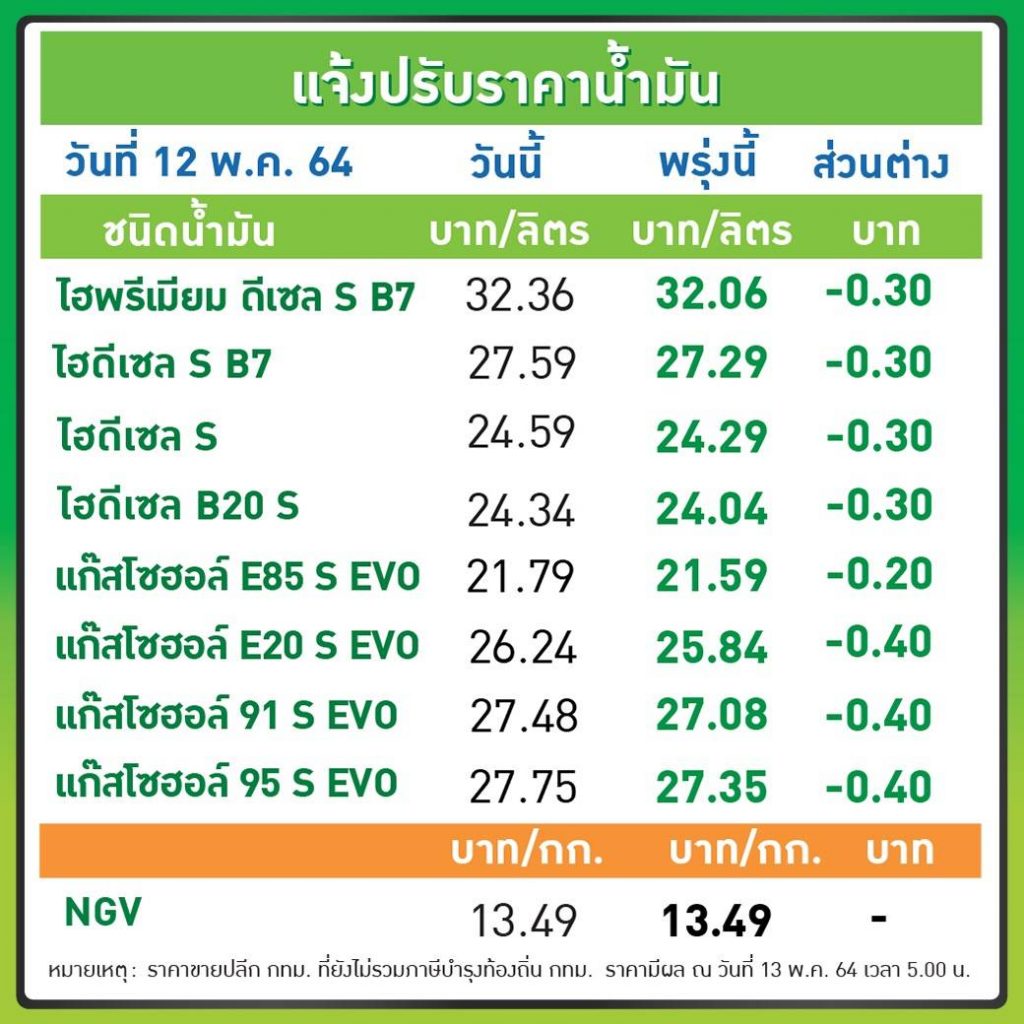 PTT Station บางจากฯ ปรับลดราคาขายปลีกน้ำมันกลุ่มเบนซินและแก๊สโซฮอล์ทุกชนิดลง 0.40 บาทต่อลิตร เว้น E85 ลดลง 0.20 ส่วนกลุ่มดีเซล ทุกชนิด ลดลง 0.30 บาทต่อลิตร มีผล 13 พ.ค.64 เวลา 05.00 น. เป็นต้นไป โดยราคาขายปลีกจะเป็นดังนี้ ULG = 34.76, GSH95 = 27.35, E20 = 25.84, GSH91 = 27.08, E85 = 21.59, HSD- B7= 27.29, HSD-B10 = 24.29, HSD-B20 = 24.04,ดีเซลพรีเมี่ยม B7 = 31.96 บาทต่อลิตร โดยราคาขายปลีกข้างต้นยังไม่รวมภาษีบำรุงกรุงเทพมหานคร.-สำนักข่าวไทย