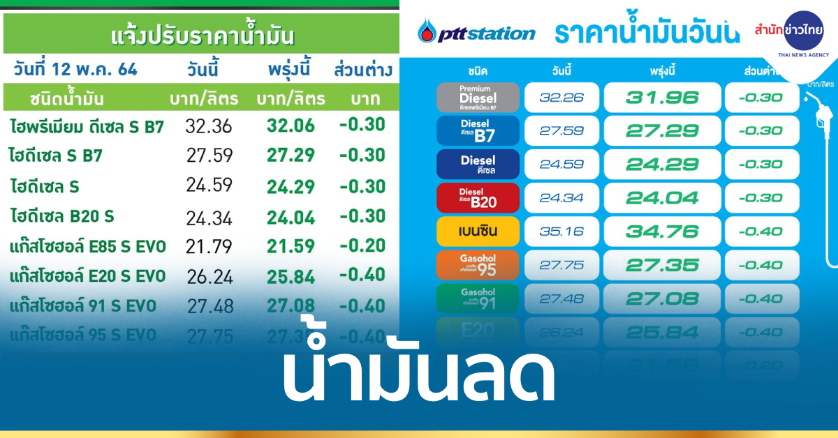 กรุงเทพฯ 12 พ.ค.-PTT Station บางจากฯ ปรับลดราคาขายปลีกน้ำมันกลุ่มเบนซิน-แก๊สโซฮอล์ทุกชนิดลง 40 สตางค์/ลิตร เว้น E85 ลดลง 20 สตางค์ ส่วนกลุ่มดีเซล ทุกชนิด ลดลง 30 สตางค์/ลิตร มีผลพรุ่งนี้ (13 พ.ค.)