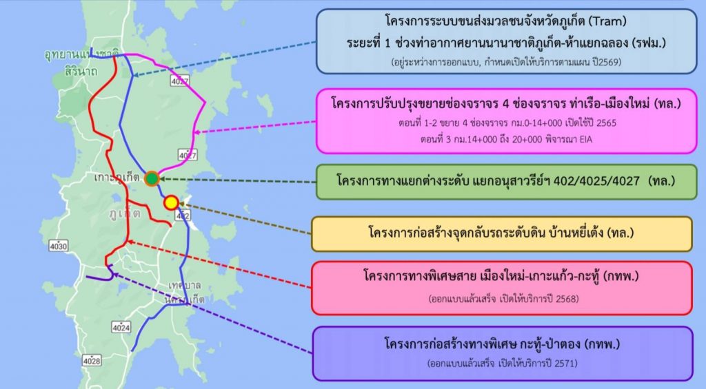 ที่ประชุม ได้หารือ 3 แนวทางสำคัญ ประกอบด้วย การทบทวนการคาดการณ์การเดินทางและผู้โดยสารของจังหวัดภูเก็ต และแนวทางการบริหารการจราจรขณะก่อสร้างทั้งระบบ โดย สำนักงานนโยบายและแผนการขนส่งและจราจร หรือ สนข. ได้บูรณาการความร่วมมือกับการทางพิเศษแห่งประเทศไทย หรือ กทพ. และรฟม. ทบทวนการคาดการณ์ปริมาณผู้โดยสารและการเดินทาง โดยวิเคราะห์ภาพรวมการเดินของจังหวัดภูเก็ต ได้ข้อสรุป 2ทางเลือกที่มีความเหมาะสมทางเศรษฐกิจและสังคม 2 คือ ทางเลือกที่ 1 ดำเนินการก่อสร้างโครงการระบบขนส่งมวลชน และโครงการทางพิเศษตามแผนงานเดิม ที่มีกำหนดการเปิดให้บริการในปี 2569 และ 2571 ตามลำดับ โดยกรณีนี้ มีข้อดีคือ โครงการจะสามารถเปิดให้บริการได้ตามแผนงาน แต่ในระหว่างการก่อสร้างจะมีผลกระทบด้านการจราจรมาก ส่วน ทางเลือกที่ 2 ดำเนินการก่อสร้างทางพิเศษตามแผนงานเดิม (เปิดให้บริการปี 2571) แต่ชะลอแผนการก่อสร้างโครงการระบบขนส่งมวลชน (กำหนดเปิดให้บริการปี 2573) เพื่อรอให้โครงการทางพิเศษบางส่วนเปิดให้บริการก่อน (กำหนดเปิดให้บริการ ปี 2571) ซึ่งกรณีนี้จะทำให้มีผลกระทบด้านการจราจรระหว่างการก่อสร้างน้อย เนื่องจากประชาชนมีโครงการทางพิเศษ เป็นทางเลือกในการเดินทาง