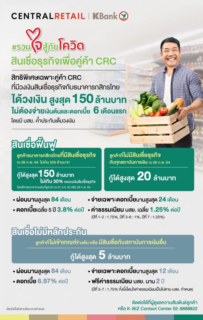 นายพัชร สมะลาภา กรรมการผู้จัดการ ธนาคารกสิกรไทย เปิดเผยว่า กลุ่มคู่ค้าหลักของเซ็นทรัล รีเทล คือ กลุ่มซัพพลายเออร์ SME ซึ่งเป็นผู้ประกอบการที่กระจายอยู่ทั่วประเทศ และประสบปัญหาขาดสภาพคล่องจากวิกฤตที่เกิดขึ้น โดยจะช่วยเหลือเพื่อให้มีเงินทุนเสริมสภาพคล่องให้กับธุรกิจเร็วที่สุด ธนาคารและเซ็นทรัล รีเทลจึงร่วมกันทำโครงการ “สินเชื่อเพื่อคู่ค้า CRC” อัดฉีดเงินกู้ 5,000 ล้านบาท เพื่อช่วยเพิ่มสภาพคล่องให้กับคู่ค้าของเซ็นทรัล รีเทล ทั้งคู่ค้าที่เป็นลูกค้าเดิมและลูกค้าใหม่ของธนาคาร โดยปัจจุบันมีคู่ค้าที่เป็นลูกค้าเดิมของธนาคาร 3,500 ราย มีวงเงินสินเชื่ออยู่ 86,000 ล้านบาท ซึ่งการช่วยเหลือมี 2 รูปแบบดังนี้