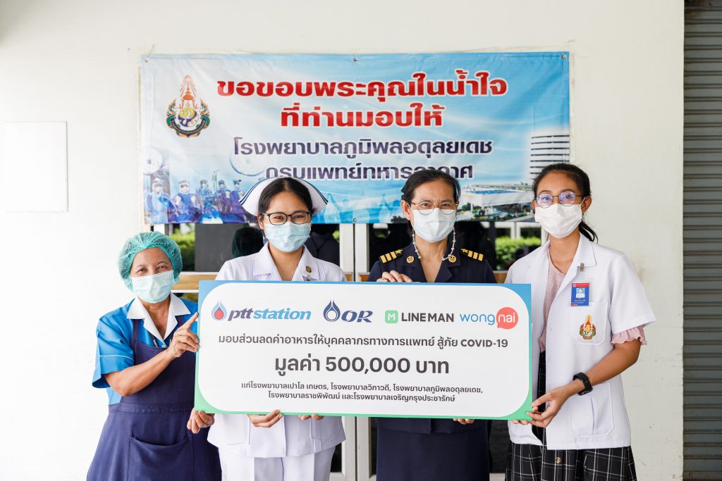 ด้าน บริษัท ปตท. น้ำมันและการค้าปลีก จำกัด (มหาชน) หรือOR เปิดเผยว่า โออาร์จับมือ LINE MAN Wongnai ส่งกำลังใจถึงบุคลากรด่านหน้าในการสกัดโรคโควิด-19 มอบโค้ดส่วนลดค่าอาหารมูลค่ารวม 5 แสนบาทให้แก่แพทย์ พยาบาล และบุคลากรทางการแพทย์ใน 5 โรงพยาบาล ได้แก่ โรงพยาบาลเปาโลเกษตร โรงพยาบาลวิภาวดี โรงพยาบาลภูมิพลอดุลยเดช โรงพยาบาลราชพิพัฒน์ และโรงพยาบาลเจริญกรุงประชารักษ์ เติมพลังในการปฏิบัติหน้าที่ดูแลผู้ป่วย ให้บุคลากรทางการแพทย์ในการสั่งอาหารจากร้านอาหารจากทั่วกรุงเทพฯ