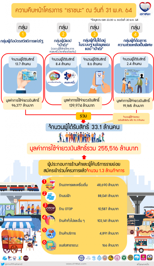 นอกจากนี้ โฆษกกระทรวงการคลังได้แถลงเพิ่มเติมถึงความคืบหน้าของโครงการเราชนะ ณ วันที่ 31 พฤษภาคม 2564 ดังนี้ 1) ประชาชนกลุ่มผู้ถือบัตรสวัสดิการแห่งรัฐ จำนวน 13.7 ล้านคน ได้มีการใช้จ่ายตั้งแต่วันที่ 5 กุมภาพันธ์ 2564 เป็นต้นมา จำนวน 96,377 ล้านบาท 2) ประชาชนกลุ่มที่อยู่ในระบบฐานข้อมูลของแอปพลิเคชัน “เป๋าตัง” ในโครงการเราเที่ยวด้วยกันและคนละครึ่ง และกลุ่มประชาชนทั่วไปที่ลงทะเบียนทางเว็บไซต์ www.เราชนะ.com ที่ผ่านการคัดกรองคุณสมบัติแล้ว จำนวน 17.0 ล้านคน และมีการใช้จ่ายวงเงินสิทธิ์สะสม ตั้งแต่วันที่ 18 กุมภาพันธ์ 2564 เป็นต้นมา จำนวน 139,974 ล้านบาท และ 3) ประชาชนกลุ่มผู้ที่ต้องการความช่วยเหลือเป็นพิเศษที่ผ่านการคัดกรองคุณสมบัติแล้ว จำนวน 2.4 ล้านคน มียอดใช้จ่ายวงเงินสิทธิ์สะสมตั้งแต่วันที่ 5 มีนาคม 2564 เป็นต้นมา จำนวน 19,165 ล้านบาท ทำให้มีมูลค่าการใช้จ่ายหมุนเวียนในระบบเศรษฐกิจไทยแล้วกว่า 255,516 ล้านบาท ซึ่งเป็นการใช้จ่ายผ่านผู้ประกอบการร้านธงฟ้าราคาประหยัดพัฒนาเศรษฐกิจท้องถิ่นที่มีแอปพลิเคชัน “ถุงเงิน” ร้านค้าคนละครึ่งที่ตกลงยินยอมเข้าร่วมโครงการฯ รวมถึงผู้ประกอบการร้านค้าและผู้ให้บริการที่ลงทะเบียนเข้าร่วมโครงการฯ จำนวนทั้งสิ้นมากกว่า 1.3 ล้านกิจการ .-สำนักข่าวไทย