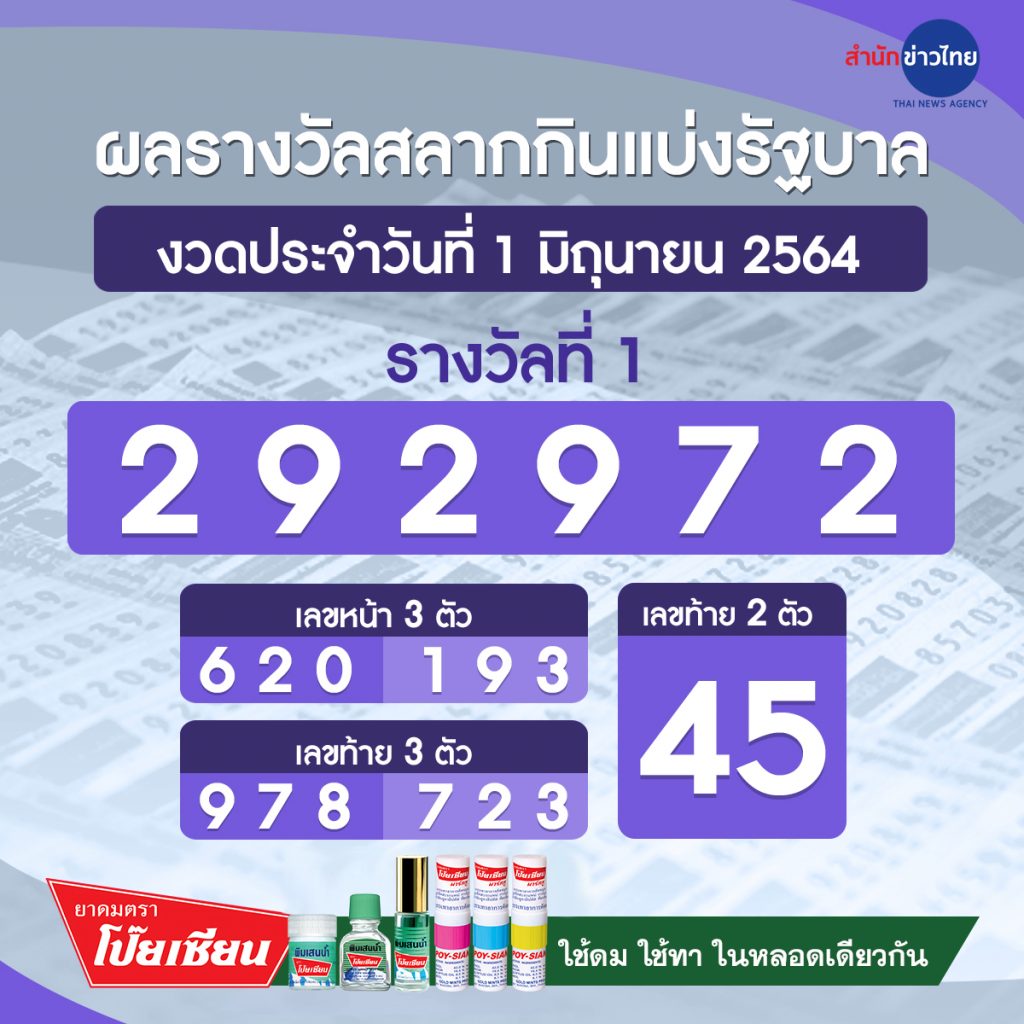 ผลรางวัลสลากกินแบ่งรัฐบาล งวดวันที่ 1 มิถุนายน 2564