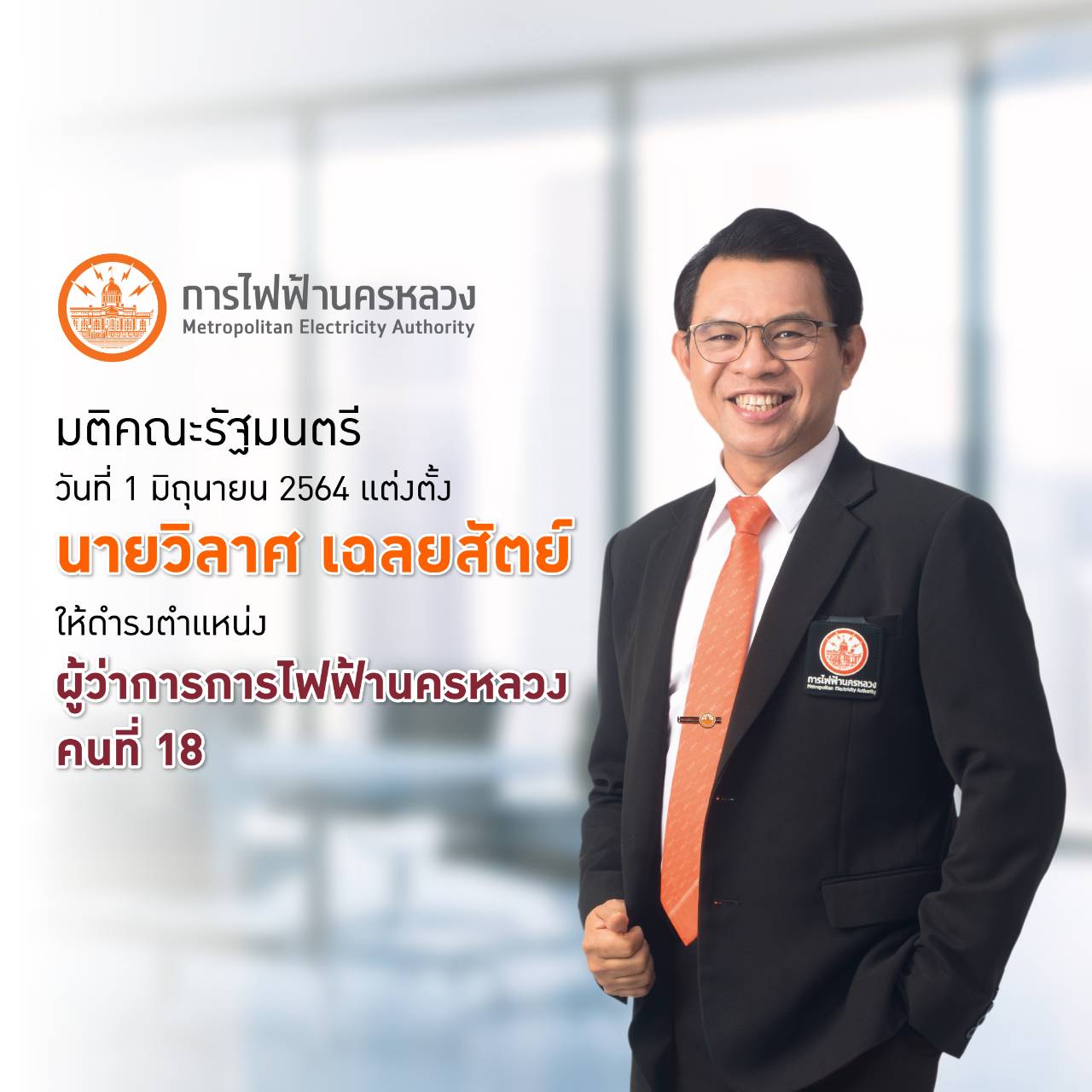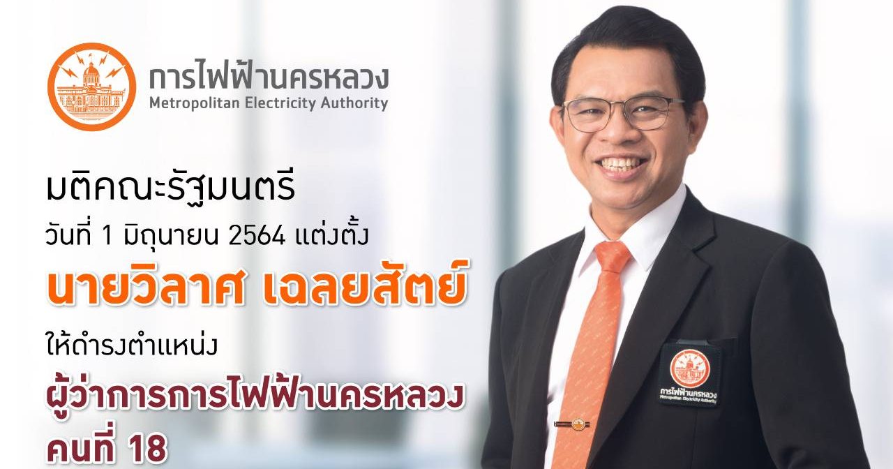 กรุงเทพฯ 2 มิ.ย.- เมื่อวันที่ 1 มิ.ย.64 คณะรัฐมนตรีมีมติเห็นชอบการแต่งตั้ง นายวิลาศ เฉลยสัตย์ ดำรงตำแหน่งผู้ว่าการการไฟฟ้านครหลวง หรือ MEA คนที่ 18 ทั้งนี้ ให้มีผลตั้งแต่วันที่ลงนามในสัญญาจ้างเป็นต้นไป แต่ไม่ก่อนวันที่ 22 สิงหาคม 2564