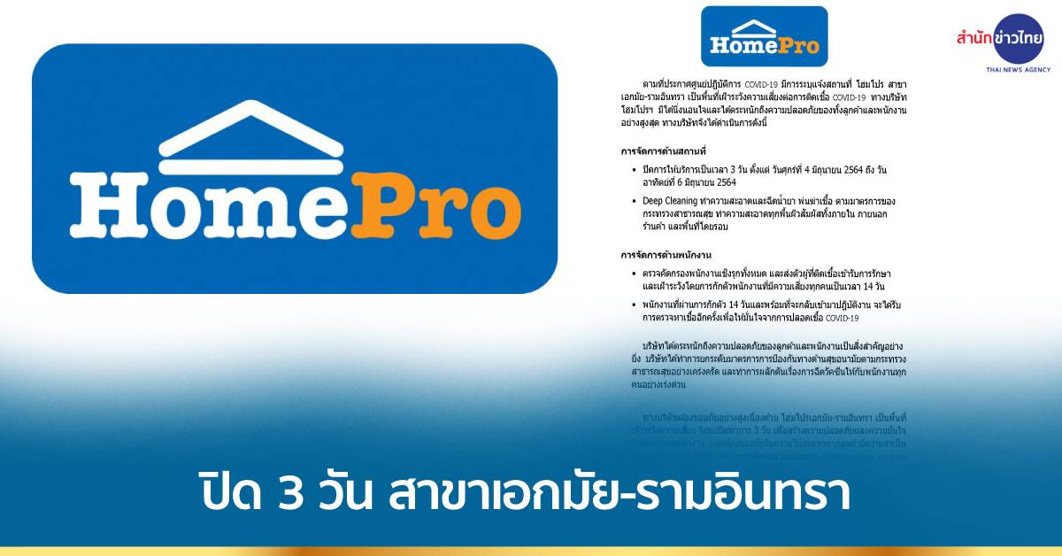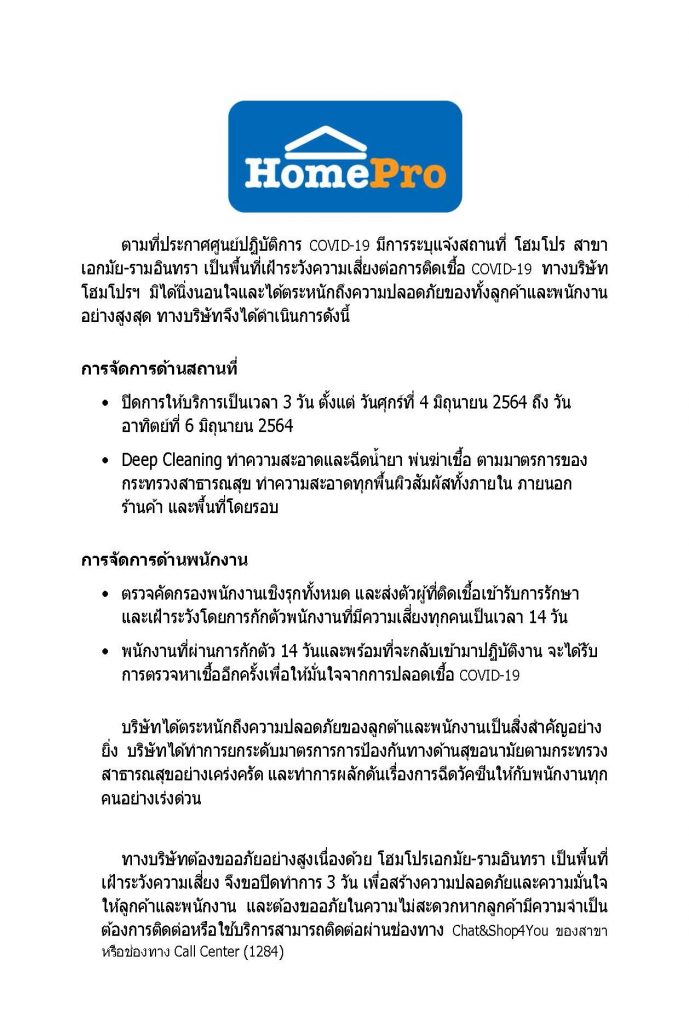“บริษัทต้องขออภัยอย่างสูงเนื่องด้วย โฮมโปรเอกมัย-รามอินทรา เป็นพื้นที่เฝ้าระวังความเสี่ยง จึงขอปิดทำการ 3 วัน เพื่อสร้างความปลอดภัยและความมั่นใจ ให้ลูกค้าและพนักงาน และต้องขออภัยในความไม่สะดวก” โฮมโปรระบุ.-สำนักข่าวไทย