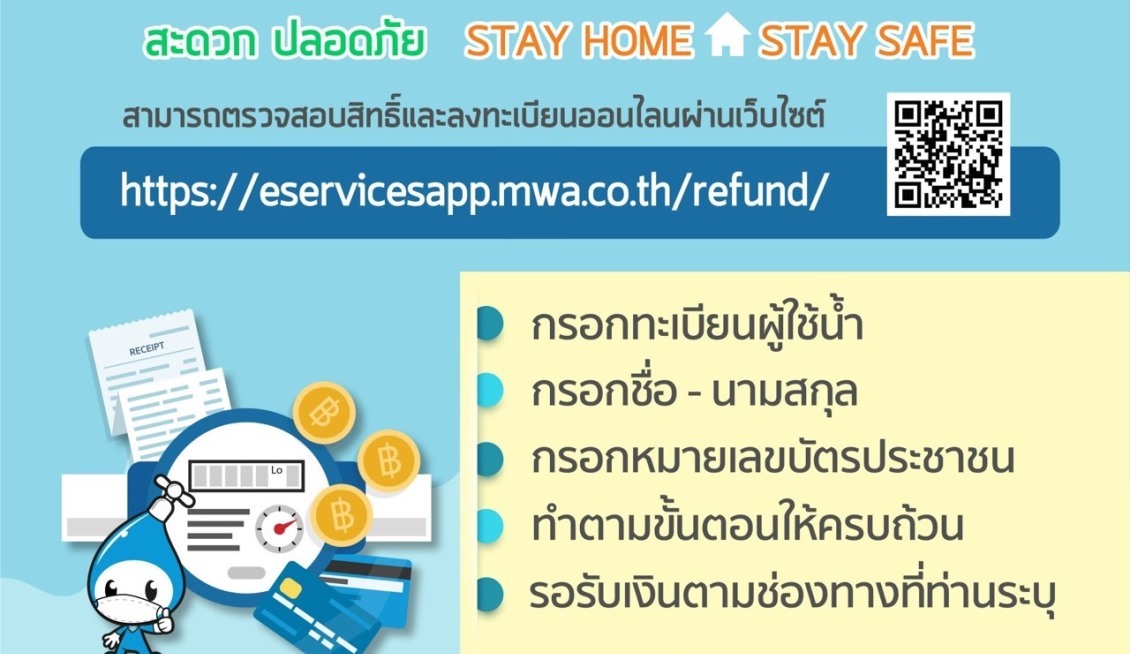 ทั้งนี้ กปน.ได้ปรับเปลี่ยนช่องทางการคืนเงินประกันมิเตอร์น้ำ เพื่อช่วยลดความเสี่ยงจากโควิด – 19 จากเดิม 3 ช่องทาง คือ พร้อมเพย์ บัญชีธนาคาร และเคาน์เตอร์เซอร์วิส เหลือ 2 ช่องทาง คือ พร้อมเพย์และบัญชีธนาคาร ตั้งแต่บัดนี้เป็นต้นไป โดยลูกค้าสามารถขอรับเงินประกันการใช้น้ำคืนได้ที่ https://eservicesapp.mwa.co.th/refund/ สอบถามเพิ่มเติมได้ที่ MWA call center โทร. 1125และช่องทางออนไลน์ของ กปน. ในชื่อ MWAthailand ตลอด 24 ชั่วโมง -สำนักข่าวไทย
