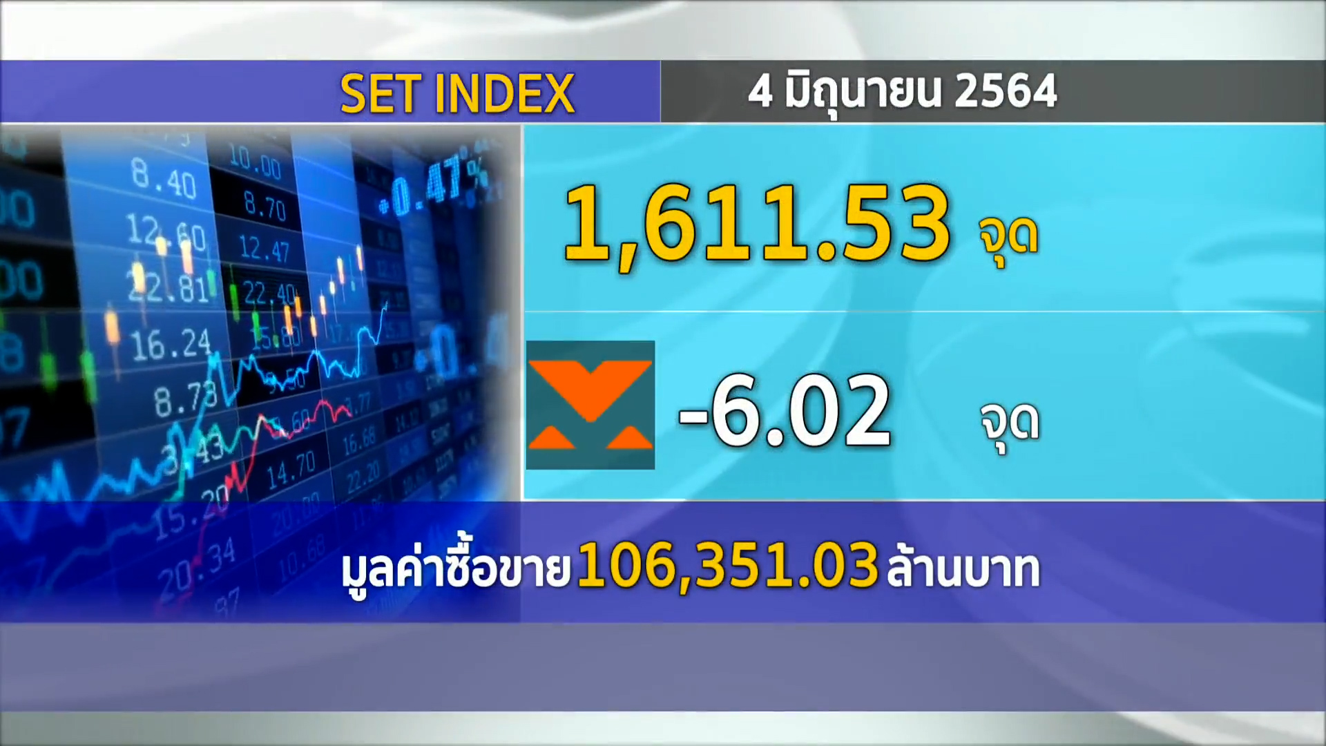กรุงเทพฯ 4 มิ.ย.-ตลาดหลักทรัพย์ปิดวันนี้ที่ระดับ 1,611.53 จุด ลดลง 6.02 จุด (-0.37%) มูลค่าการซื้อขาย 106,351.03 ล้านบาท