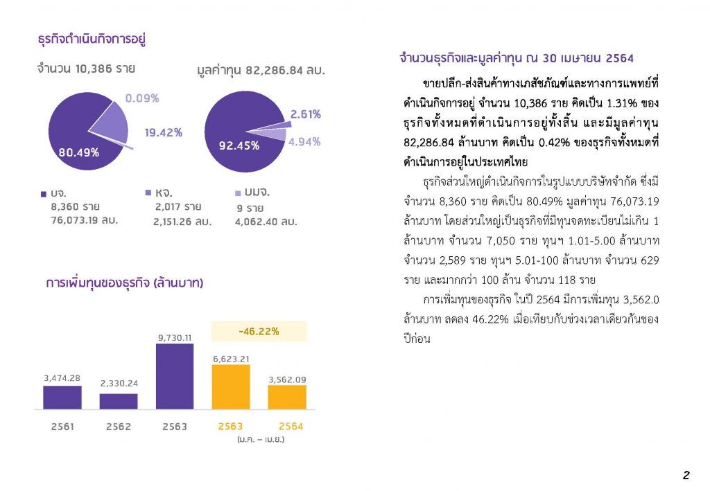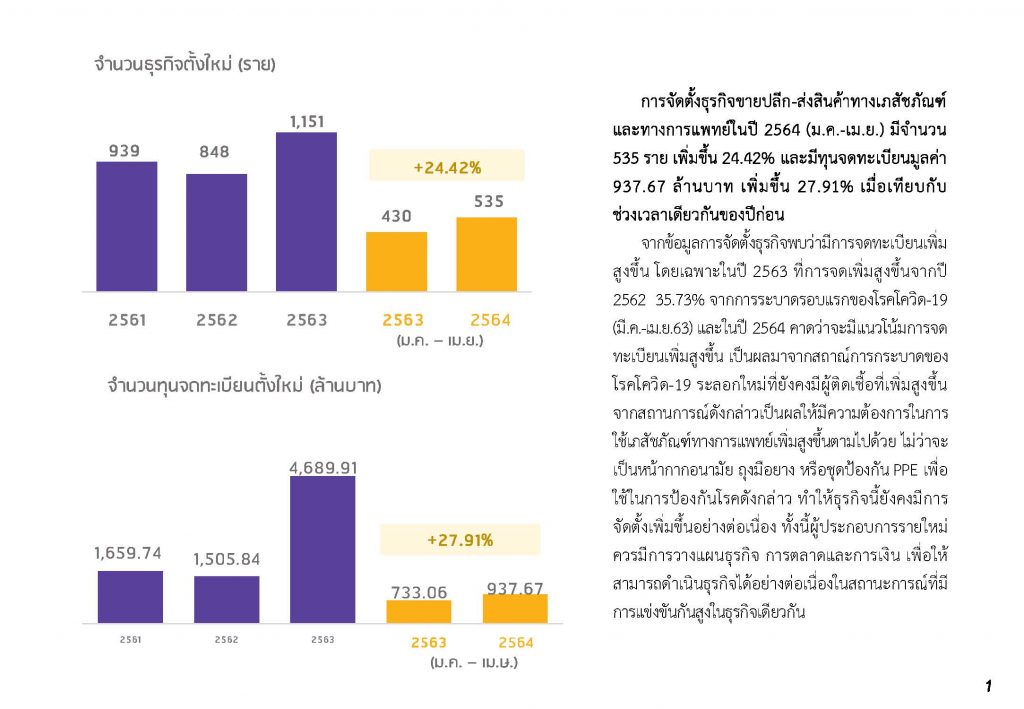 ทั้งนี้ กรมพัฒนาธุรกิจการค้า ได้วิเคราะห์ธุรกิจดาวเด่นเดือนเมษายน 2564 พบว่า ธุรกิจขายปลีก-ส่ง สินค้าทางเภสัชภัณฑ์และทางการแพทย์ มีอัตราการเติบโตขึ้นอย่างต่อเนื่อง โดยในปี 2564 (มกราคม – เมษายน) มีจำนวนการจัดตั้งธุรกิจฯ ใหม่เพิ่มขึ้นร้อยละ 24.42 เมื่อเทียบกับช่วงเวลาเดียวกันของปีที่ผ่านมา ซึ่งเป็นไปในทิศทางเดียวกันกับปริมาณความต้องการยาและวัสดุอุปกรณ์ทางการแพทย์ที่เพิ่มขึ้นในปัจจุบัน โดยข้อมูล ณ วันที่ 30 เมษายน 2564 มีธุรกิจขายปลีก-ส่ง สินค้าทางเภสัชภัณฑ์และทางการแพทย์ ที่ดำเนินกิจการอยู่ทั้งสิ้นจำนวน 10,386 ราย คิดเป็นร้อยละ 1.31 ของธุรกิจทั้งหมดที่ดำเนินกิจการอยู่ และมีมูลค่าการลงทุน 82,286.84 ล้านบาท คิดเป็นร้อยละ 0.42 ของเงินลงทุนทั้งหมดของกิจการที่ดำเนินการอยู่ในประเทศไทย ส่วนใหญ่ดำเนินการในรูปแบบบริษัทจำกัด จำนวน 8,360 ราย ร้อยละ 80.49) มูลค่าเงินลงทุน 76,073.19 ล้านบาท ห้างหุ้นส่วนจำกัด จำนวน 2,017 ราย ร้อยละ 19.42 มูลค่าเงินลงทุน 2,151.26 ล้านบาท และ บริษัทมหาชนจำกัด 9 ราย (ร้อยละ 0.09) มูลค่าเงินลงทุน 4,062.40 ล้านบาท