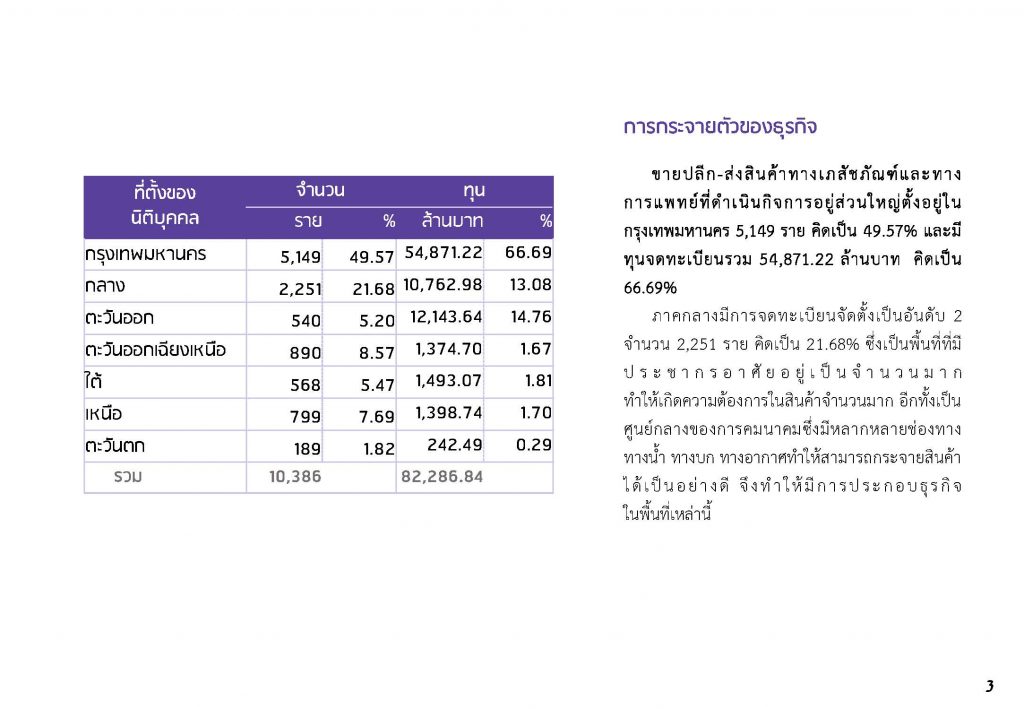 อน่างไรก็ตาม ธุรกิจฯ ส่วนใหญ่ตั้งอยู่ในเขตกรุงเทพมหานคร จำนวน 5,149 ราย ร้อยละ 49.57 และมีทุนจดทะเบียน 54,871.22 ล้านบาท ร้อยละ 66.69 และอันดับ 2 ตั้งอยู่ภาคกลาง จำนวน 2,215 ราย ร้อยละ 21.68 ซึ่งเป็นพื้นที่ที่มีประชากรอาศัยอยู่เป็นจำนวนมาก ทำให้เกิดความต้องการสินค้าจำนวนมาก อีกทั้งเป็นศูนย์กลางการขนส่งคมนาคมที่มีความหลากหลายทั้งทางน้ำ ทางบก และทางอากาศ ทำให้สามารถกระจายสินค้าได้เป็นอย่างดี