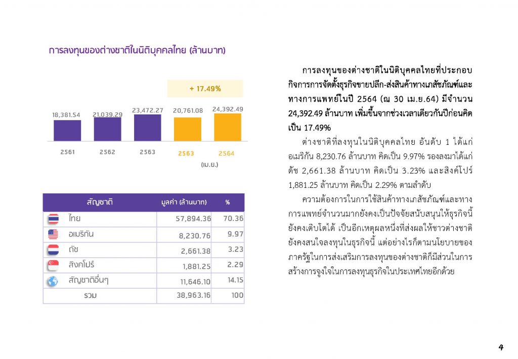 นนทบุรี 5 มิ.ย.-รัฐมนตรีช่วยพาณิชย์ระบุธุรกิจขายปลีก-ส่ง สินค้าทางเภสัชภัณฑ์และทางการแพทย์ ช่วง 4 เดือนปี 64 จัดตั้งธุรกิจเพิ่มขึ้นร้อยละ 24.42 ขณะที่นักลงทุนต่างชาติเข้ามาลงทุนเพิ่มร้อยละ 17.49 ธุรกิจไซส์เล็กมีกำไรสุทธิถึงร้อยละ 51.76 ของผลกำไรทั้งธุรกิจ