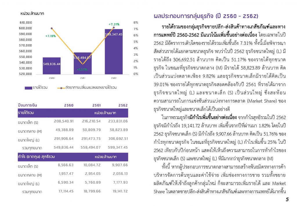 นอกจากนี้ เมื่อพิจารณาจากผลกำไรของกลุ่มธุรกิจฯ ตั้งแต่ปี 2560 – 2562 พบว่า มีแนวโน้มเพิ่มขึ้นอย่างต่อเนื่อง ปี 2560 กำไรสุทธิ 17,114.45 ล้านบาท ปี 2561 กำไรสุทธิ 18,799.66 ล้านบาท ปี 2562 มีกำไรสุทธิ 19,141.72 ล้านบาท เพิ่มขึ้นจากปีที่ผ่านมาร้อยละ 1.82 ปี 2563 อยู่ระหว่างการวิเคราะห์และประมวลผล โดยธุรกิจขนาดเล็ก (S) มีกำไรถึง 9,907.66 ล้านบาท ร้อยละ 51.76 ของกำไรจากทุกขนาดธุรกิจ ในขณะที่ธุรกิจขนาดใหญ่ (L) มีกำไรเพิ่มขึ้นร้อยละ 25 เมื่อเทียบกับปี 2561 แสดงให้เห็นถึงความสามารถในการทำกำไรของธุรกิจขนาดเล็ก (S) และขนาดใหญ่ (L) ที่มีมากกว่าธุรกิจขนาดกลาง (M) ดังนั้น หากผู้ประกอบการขนาดกลางสามารถสร้างพันธมิตรทางธุรกิจ มีการบริหารจัดการธุรกิจและค่าใช้จ่ายที่ดี เพิ่มช่องทางการจำหน่ายสินค้า รวมทั้ง ขยายผลิตภัณฑ์ให้เข้าถึงลูกค้ากลุ่มใหม่ ก็จะสามารถเพิ่มรายได้ และส่วนแบ่งทางการตลาด (Market Share) ในตลาดขายปลีก-ส่ง สินค้าทางเภสัชภัณฑ์และทางการแพทย์ได้เพิ่มมากขึ้น