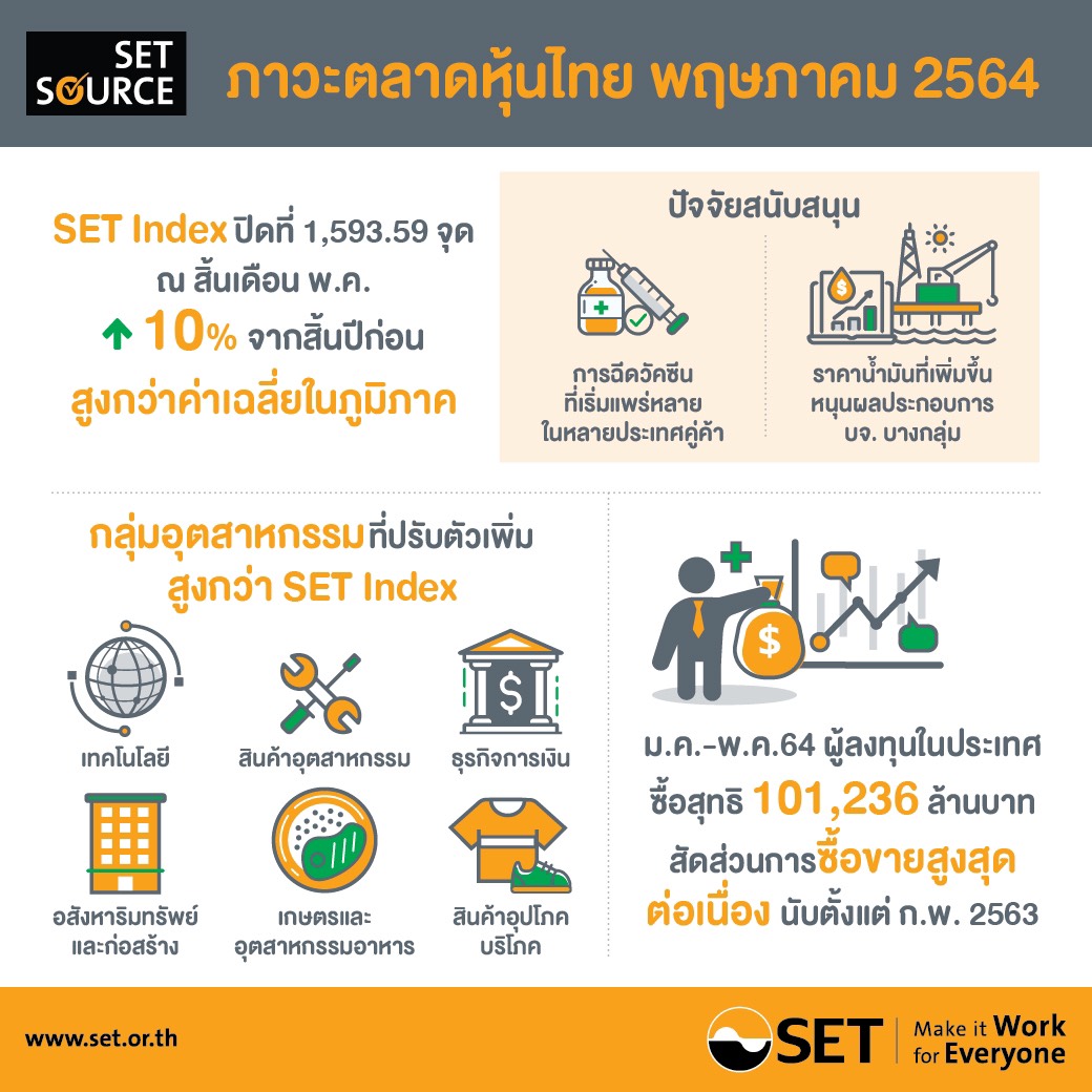 นายศรพล ตุลยะเสถียร รองผู้จัดการ หัวหน้าสายงานวางแผนกลยุทธ์องค์กร ตลาดหลักทรัพย์แห่งประเทศไทย (ตลท.) เปิดเผยว่า ณ สิ้นเดือน พ.ค.64 SET Index ปิดที่ 1,593.59 จุด เพิ่มขึ้น 10.0% จากสิ้นปี 63 ถือเป็นการปรับเพิ่มขึ้นสูงกว่าค่าเฉลี่ยของดัชนีตลาดหลักทรัพย์อื่นๆ โดยอุตสาหกรรมที่ปรับตัวดีกว่า SET Index เมื่อเทียบกับสิ้นปี 63 ได้แก่กลุ่มสินค้าอุตสาหกรรม กลุ่มเกษตรและอุตสาหกรรมอาหาร กลุ่มสินค้าอุปโภคบริโภค กลุ่มอสังหาริมทรัพย์และก่อสร้าง กลุ่มเทคโนโลยี และ กลุ่มธุรกิจการเงิน