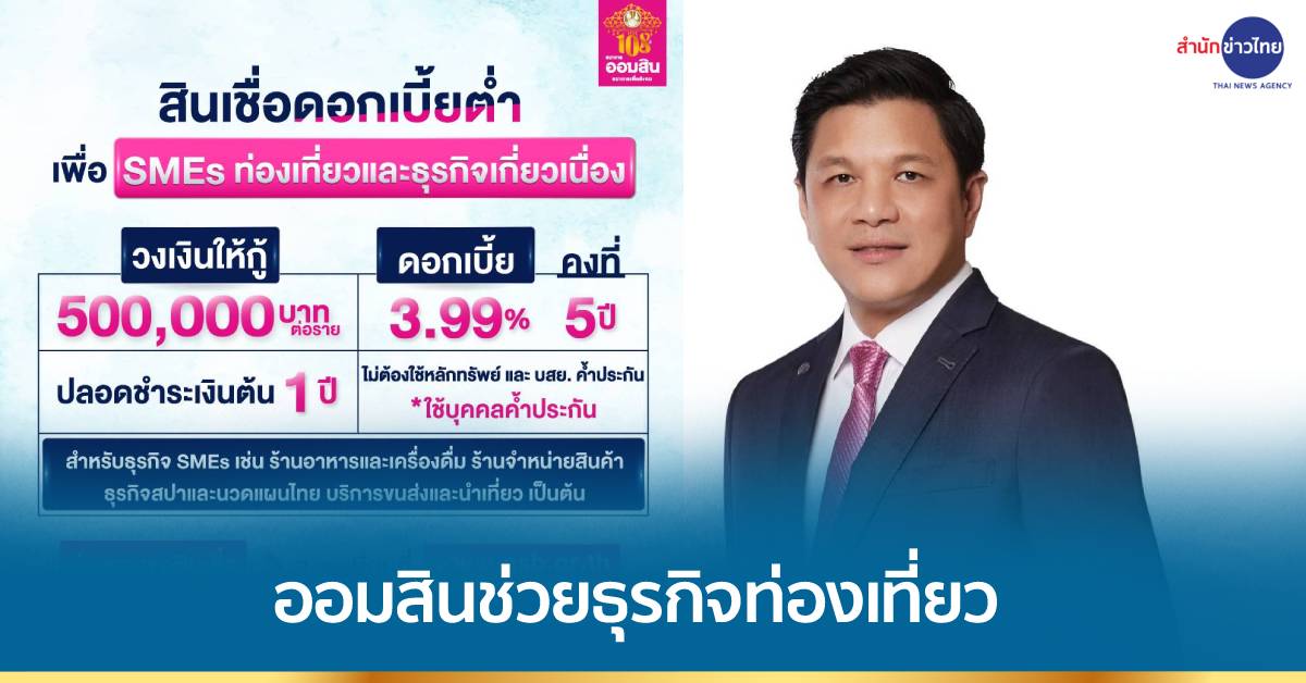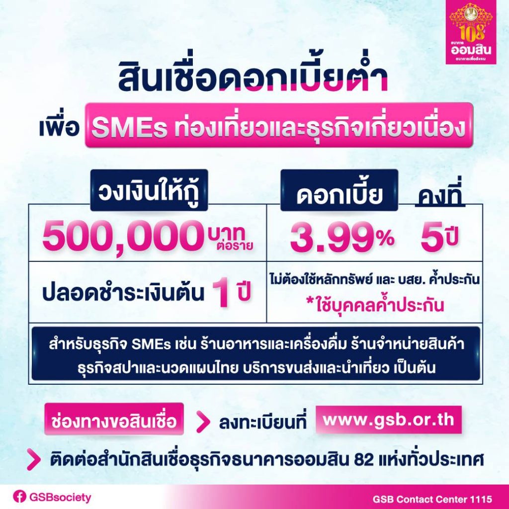 โครงการสินเชื่อดอกเบี้ยต่ำ ออมสินช่วยเหลือ SMEs ในภาคการท่องเที่ยว เป็นความตั้งใจของธนาคารออมสินที่จะช่วยเหลือผู้ประกอบการ SMEs ท่องเที่ยวและธุรกิจเกี่ยวเนื่อง โดยการให้สินเชื่อสำหรับใช้เป็นเงินทุนดำเนินกิจการหรือเสริมสภาพคล่อง วงเงินกู้สูงสุดรายละ 500,000 บาท ให้กู้เป็นระยะเวลา 5 ปี อัตราดอกเบี้ยคงที่ 5 ปีเท่ากับ 3.99% และปลอดชำระเงินต้นในปีแรก ผู้มีสิทธิ์กู้เป็นบุคคลธรรมดาและนิติบุคคล ใช้บุคคลเป็นหลักประกันการกู้ ไม่ต้องใช้หลักทรัพย์และ บสย. ค้ำประกัน ทั้งนี้ ธนาคารฯ ผ่อนปรนเกณฑ์การพิจารณาโดยดูรายได้ในอดีตของกิจการเป็นหลัก เนื่องจากธนาคารฯ ทราบดีว่าปัจจุบันกิจการต้องขาดรายได้เพราะได้รับผลกระทบจากการแพร่ระบาด