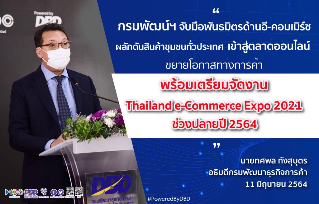 นอกจากนี้ กรมฯ ได้ร่วมกับหน่วยงานภาครัฐและภาคเอกชนด้านอี-คอมเมิร์ซชั้นนำกว่า 50 หน่วยงาน เตรียมจัดงานมหกรรม Thailand e-Commerce Expo 2021 ขึ้นในช่วงปลายปี 2564 เพื่อส่งเสริมและพัฒนาศักยภาพให้ผู้ประกอบการฐานรากสามารถทำการค้าออนไลน์ได้อย่างมีประสิทธิภาพและครบวงจร โดยแบ่งพื้นที่การจัดงานออกเป็น 6 โซน ประกอบด้วย โซนที่ 1 ผู้ให้บริการด้านพาณิชย์อิเล็กทรอนิกส์ครบวงจร โซนที่ 2 เสริมสร้างผู้ประกอบการพาณิชย์อิเล็กทรอนิกส์ โซนที่ 3 แข่งขันการนำเสนอผลงานการพัฒนาสินค้าชุมชนเข้าสู่ช่องทางออนไลน์ โซนที่ 4 : โซนจัดแสดงผลงาน Showcase โซนที่ 5 ศูนย์บริการด้านพาณิชย์อิเล็กทรอนิกส์ โซนที่ 6 โซนนำเสนอสินค้าชุมชนทั้งนี้ ผู้ประกอบการที่เข้าร่วมโครงการสามารถร่วมลุ้นรางวัล “สุดยอด e-Commerce Genius แห่งปี” จำนวน 3 รางวัล เพื่อเป็นร้านต้นแบบให้กับผู้ประกอบการรายอื่นๆ ต่อไป