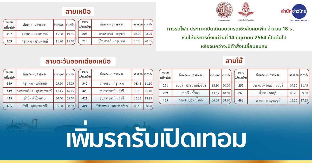 นายนิรุฒ มณีพันธ์ ผู้ว่าการรถไฟแห่งประเทศไทย เปิดเผยว่า เพื่อเป็นการอำนวยความสะดวกในการเดินทางแก่พี่น้องประชาชน ตลอดจนนักเรียน นิสิต นักศึกษา ซึ่งมีสถานบันการศึกษาเริ่มเปิดทำการเรียนการสอนในหลายพื้นที่ การรถไฟฯ จึงได้ประกาศเปิดเดินขบวนรถชานเมืองและขบวนรถท้องถิ่นเพิ่มเติมอีก 18 ขบวน ในเส้นทางสายสายเหนือ 4 ขบวน สายตะวันออกเฉียงเหนือ 8 ขบวน และสายใต้ 6 ขบวน เริ่มตั้งแต่วันที่ 14 มิถุนายน 2564 เป็นต้นไป โดยมีขบวนรถที่ให้บริการในเส้นทางต่างๆ ดังนี้
