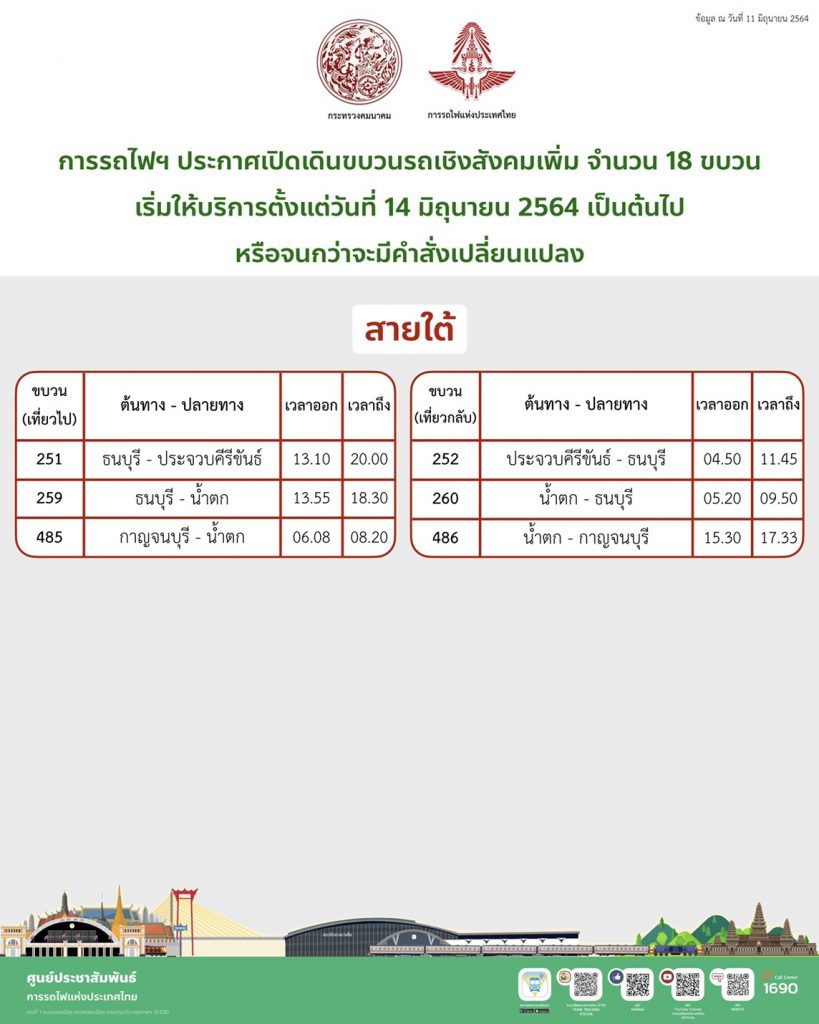 ทั้งนี้ การรถไฟฯ ยังดำเนินมาตรการเฝ้าระวังและป้องกันการแพร่ระบาดของไวรัสโควิด-19 ในการให้บริการแก่ผู้โดยสารทั้งในขบวนรถโดยสาร สถานีรถไฟทั่วประเทศอย่างเคร่งครัด เพื่อให้เกิดความปลอดภัย และลดความเสี่ยงจากการแพร่ระบาดของไวรัสโควิด-19 ตลอดการเดินทาง สำหรับผู้โดยสารที่ประสงค์เดินทาง สอบถามข้อมูลเพิ่มเติมได้ที่สถานีรถไฟทั่วประเทศ ศูนย์บริการลูกค้าสัมพันธ์ หมายเลขโทรศัพท์ 1690 ตลอด 24 ชั่วโมง หรือ เฟซบุ๊ก แฟนเพจ ทีมพีอาร์การรถไฟแห่งประเทศไทย.รถไฟแห่งประเทศไทย.-สำนักข่าวไทย