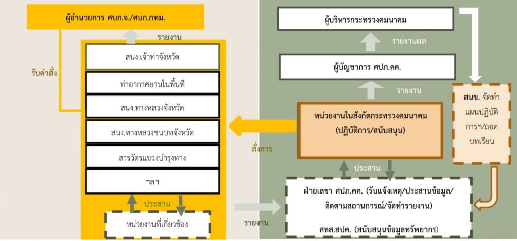 โครงสร้างการประสานสั่งการพิจารณาจากการจัดระดับความรุนแรงในแผนการป้องกันและบรรเทาสาธารณภัยแห่งชาติ พ.ศ.2558 อุทกภัยน้ำท่วมจะเป็นสาธารณภัยขนาดกลาง ซึ่งมีศูนย์บัญชาการเหตุการณ์ จังหวัด โดยหน่วยงานในสังกัดกระทรวงคมนาคมในพื้นที่จังหวัดจะรายงานสภาพเหตุการณ์ให้กระทรวงคมนาคม ในขณะเดียวกันกระทรวงคมนาคมได้ดำเนินการโดยจัดตั้งศูนย์ Command Center ภัยพิบัติกระทรวงคมนาคม เป็นศูนย์บัญชาการ ประสานสั่งการ รับแจ้งเหตุ ประสานข้อมูล/การสนับสนุนจากหน่วยงานที่เกี่ยวข้องทั้งภายในและภายนอก และรายงานเสนอผู้บริหารกระทรวงคมนาคม เพื่อเป็นการรองรับผลกระทบจากสถานการณ์น้ำท่วมอุทกภัยที่อาจจะเกิดขึ้นและส่งผลกระทบต่อการเดินทาง โครงสร้างพื้นฐานด้านคมนาคมตั้งแต่ ขั้นเตรียมพร้อม(ป้องกันก่อนเกิดภัย) การดำเนินการ (รับมือขณะเกิดภัย) และการฟื้นฟูซ่อมแซม (หลังเกิดภัย) และจัดทำแผนปฏิบัติการเพื่อเป็นแนวทางการดำเนินการเตรียมการดังกล่าว อาทิ