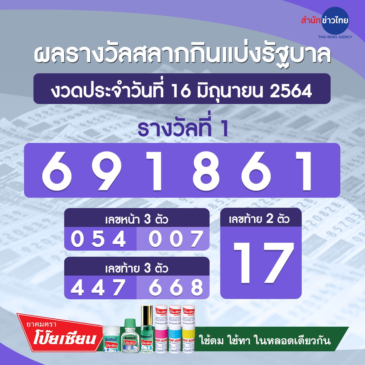 ผลรางวัลสลากกินแบ่งรัฐบาล งวดวันที่ 16 มิถุนายน 2564