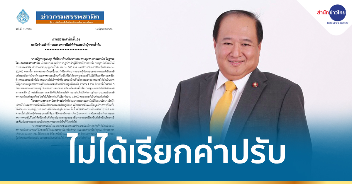 กรุงเทพฯ 16 มิ.ย.-โฆษกกรมสรรพสามิต ชี้แจงกรณีเจ้าหน้าที่ให้คำแนะนำผู้ขายน้ำส้ม ยันไม่ได้เรียกค่าปรับ 12,000 บาท ตามที่เป็นข่าวแต่อย่างใด