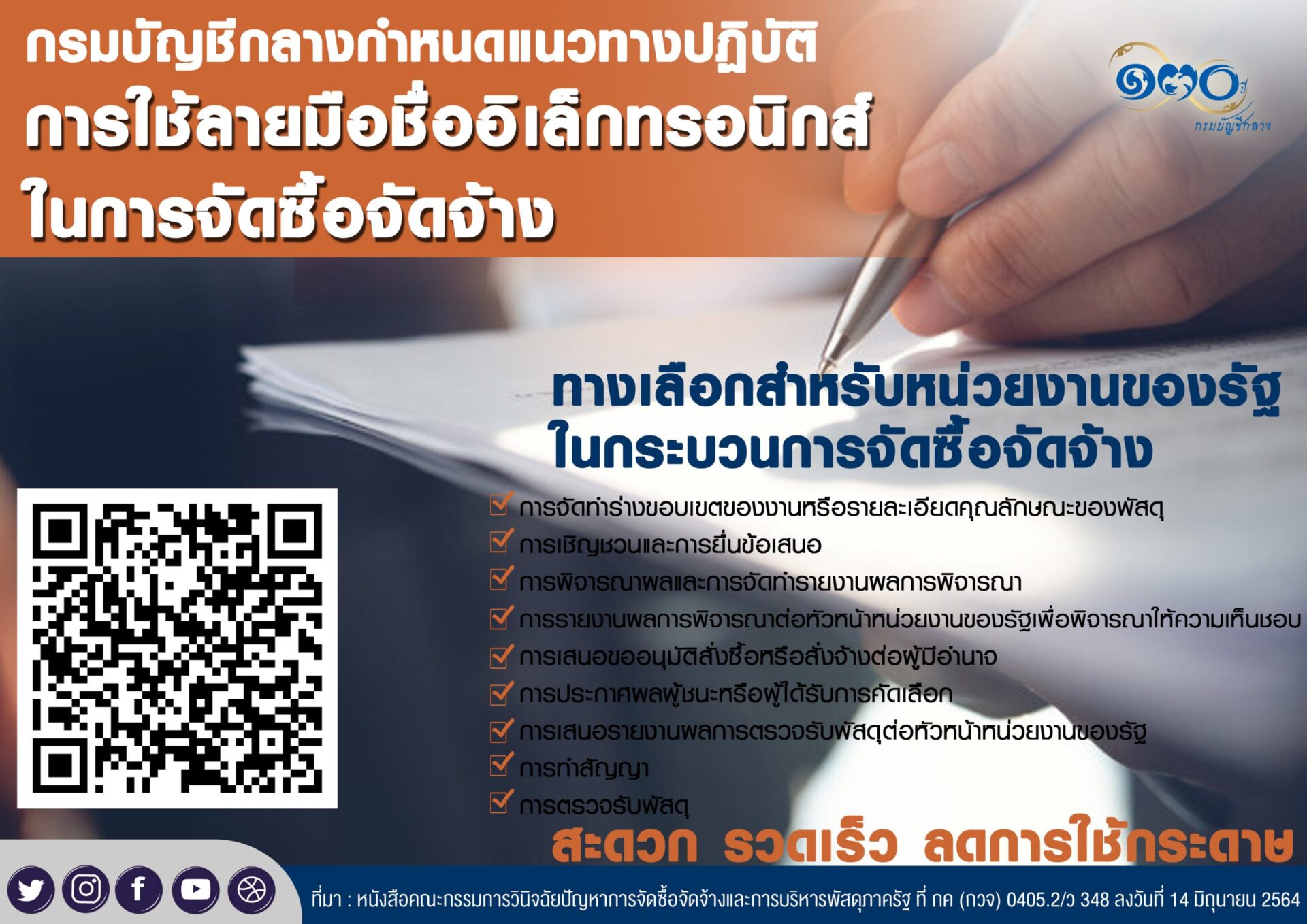 “สำหรับแนวทางปฏิบัติการใช้ลายมือชื่ออิเล็กทรอนิกส์ในการจัดซื้อจัดจ้าง ถือเป็นอีกหนึ่งทางเลือกสำหรับหน่วยงานของรัฐ มีวัตถุประสงค์เพื่อให้ขั้นตอนการดำเนินการตามกระบวนการจัดซื้อจัดจ้างมีความสะดวก รวดเร็ว ลดการใช้กระดาษและทรัพยากรธรรมชาติที่ไม่จำเป็น ทั้งนี้ สามารถศึกษาแนวทางและรายละเอียดเพิ่มเติมได้ ตามหนังสือคณะกรรมการวินิจฉัยปัญหาการจัดซื้อจัดจ้างและการบริหารพัสดุภาครัฐ ที่ กค (กวจ) 0405.2/ว 348 ลงวันที่ 14 มิถุนายน 2564 และหากมีข้อสงสัยสามารถสอบถามรายละเอียดเพิ่มเติมได้ที่ Call Center กรมบัญชีกลาง หมายเลข 02 270 6400 ในวัน เวลาราชการ” อธิบดีกรมบัญชีกลาง กล่าว