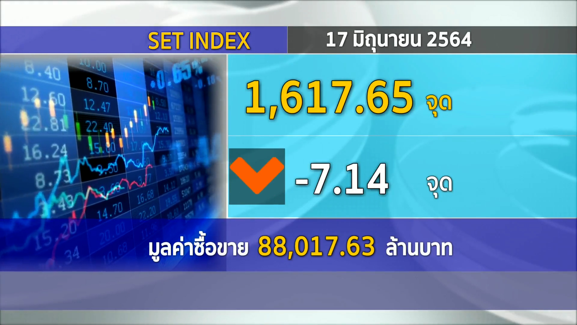 กรุงเทพฯ 17 มิ.ย.-ตลาดหลักทรัพย์ ปิดวันนี้ที่ระดับ 1,617.65 จุด ลดลง 7.14 จุด (-0.44%) มูลค่าการซื้อขาย 88,017.63 ล้านบาท ตามต่างประเทศหลังเฟดส่งสัญญาณขึ้นดอกเบี้ย-แผนฉีดวัคซีนยังสับสน