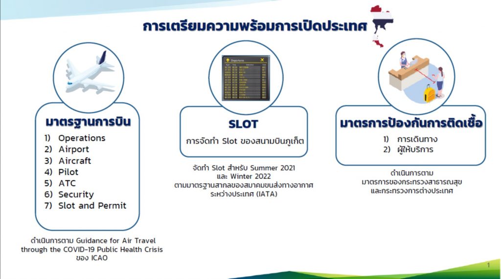 ด้านร.ต.ธานี ช่วงชู ผู้อำนวยการสนามบินภูเก็ต บริษัท ท่าอากาศยานไทย จำกัด(มหาชน) หรือ AOT กล่าวว่า ขณะนี้สนามบินภูเก็ตได้เตรียมพร้อมในทุกๆด้านเพื่อรองรับนักท่องเที่ยวที่จะเดินทางเข้ามาภูเก็ตตามนโยบายของรัฐบาล ล่าสุดขณะนี้มีสายการบินต่างชาติที่จะทำการบินเข้าภูเก็ตตั้งแต่ 1ก.ค.-เดือน ต.ค. 64 รวมกว่า 31 สายการบิน โดยเฉลี่ยเริ่มตั้งแต่เดือน ก.ค. มีสายการบินขอทำการบินเข้ามา 13 สายการบิน ให้บริการเที่ยวบินเฉลี่ย 10 เที่ยวบิน/วัน หลังจากนั้นในเดือน ส.ค. มีสายการบินขอทำการบินตรงเข้ามาเฉลี่ย 18-24 เที่ยวบิน/วันและจนถึงเดือน ก.ย.-ต.ค.ขอทำการบินตรงเข้าภูเก็ตรวมกว่า 31สายการบิน ซึ่งคาดว่า ปริมาณเที่ยวบินจะเพิ่มขึ้นเรื่อยๆ