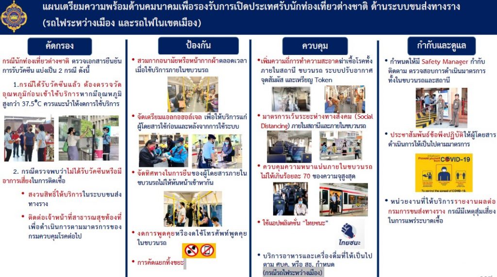 นอกจากนั้นให้ทุกหน่วยงานให้ความสำคัญกับการมี Service Mind ในการให้บริการนักท่องเที่ยวต่างชาติเพื่อให้เกิด First Impression ในการเดินทางเข้ามาท่องเที่ยวในประเทศไทย และเตรียมความพร้อมในกรณี Emergency Case โดยให้ทุกหน่วยงานให้ความสำคัญกับการฉีดวัคซีนให้แก่เจ้าหน้าที่ด่านหน้าให้ครบ 100 % เพื่อสร้างภูมิคุ้มกันหมู่ รวมทั้งพิจารณาการตรวจระดับภูมิคุ้มกันภายหลังการฉีดวัคซีนครบ 2 เข็มแล้ว