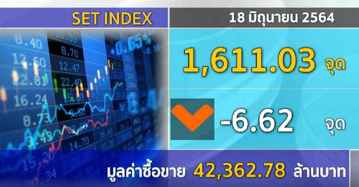 กทม. 18 มิ.ย.-ดัชนีหุ้นไทยช่วงเช้าวันนี้ แกว่งตัวแดนลบตามตลาดหุ้นฝั่งตะวันตก จากแรงกดดัน Fed ส่งสัญญาณเร่งขึ้นดอกเบี้ยและลดการใช้ QE นอกจากนี้ยังส่งผลให้ Fund flow ไหลออกอีกด้วย ดัชนีช่วงเที่ยง 1,611.03 จุด ลดลง 6.62 จุด มูลค่าซื้อขาย 42,362.78 ล้านบาท