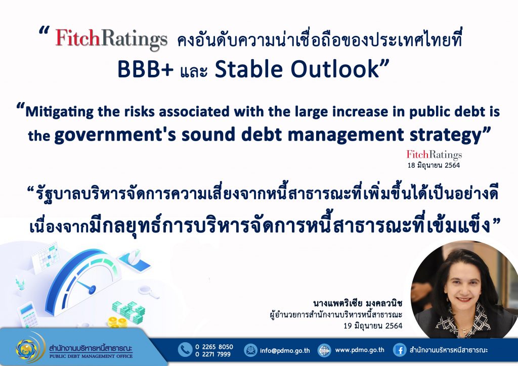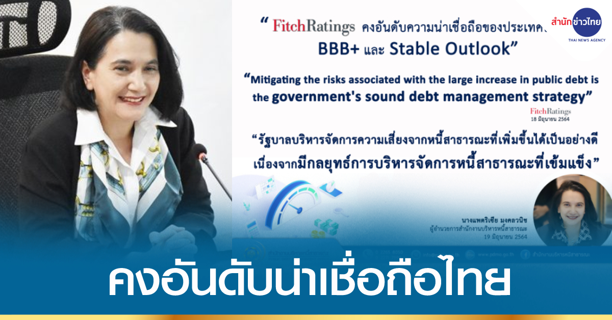 นางแพตริเซีย มงคลวนิช ผู้อำนวยการสำนักงานบริหารหนี้สาธารณะ เปิดเผยว่า บริษัท Fitch Ratings (Fitch) ได้คงอันดับความน่าเชื่อถือของไทยในระดับ BBB+ และคงมุมมองความน่าเชื่อถือของไทย มีเสถียรภาพ (Stable Outlook) ประกอบด้วย ภาคการคลังสาธารณะมีความแข็งแกร่ง จากการรักษาวินัยทางการคลัง แม้ว่าหนี้สาธารณะจะเพิ่มขึ้นจาก พ.ร.ก.เงินกู้ 1 ล้านล้านบาท ในการฟื้นฟูเศรษฐกิจและสังคม จากปัญหา COVID-19 และการจัดทำงบประมาณรายจ่ายขาดดุลปี 2564 การออก พ.ร.ก.เงินกู้ ฉบับที่ 2 วงเงิน 500,000 ล้านบาท