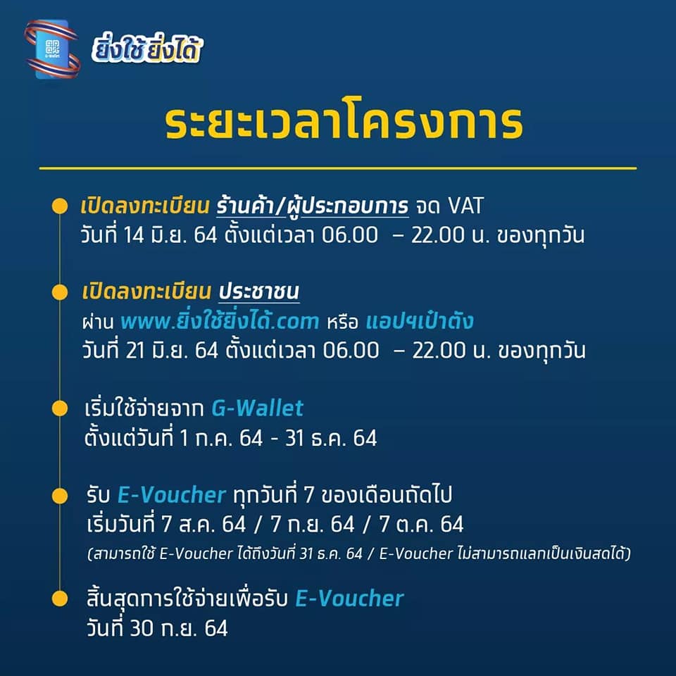 - ต้องใช้จ่ายผ่าน G-Wallet โดยการใช้จ่ายที่จะนำมาคิดคำนวน E-Voucher คือตั้งแต่ 1 ก.ค. – 30 ก.ย. 64 เท่านั้น