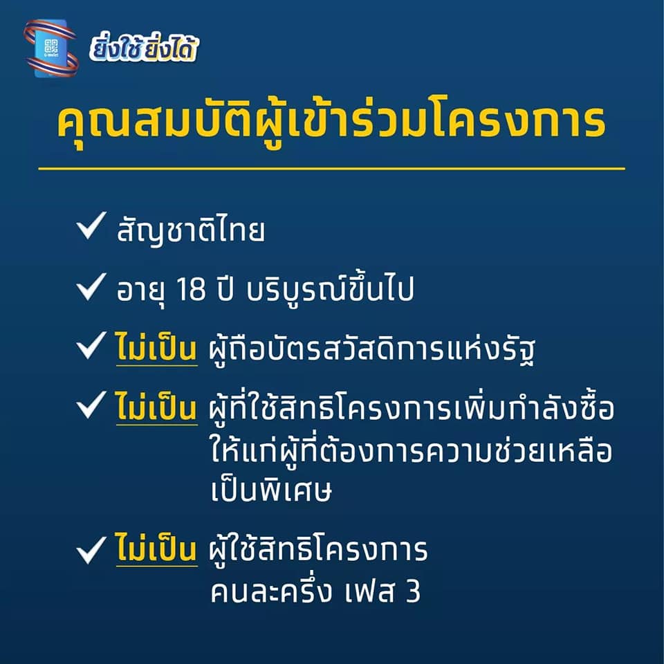 - ต้องลงทะเบียนผ่านทาง www.ยิ่งใช้ยิ่งได้.com หรือ ผ่าน banner ยิ่งใช้ยิ่งได้ในแอปฯ เป๋าตัง (สำหรับผู้เคยเข้าร่วมโครงการรัฐ)